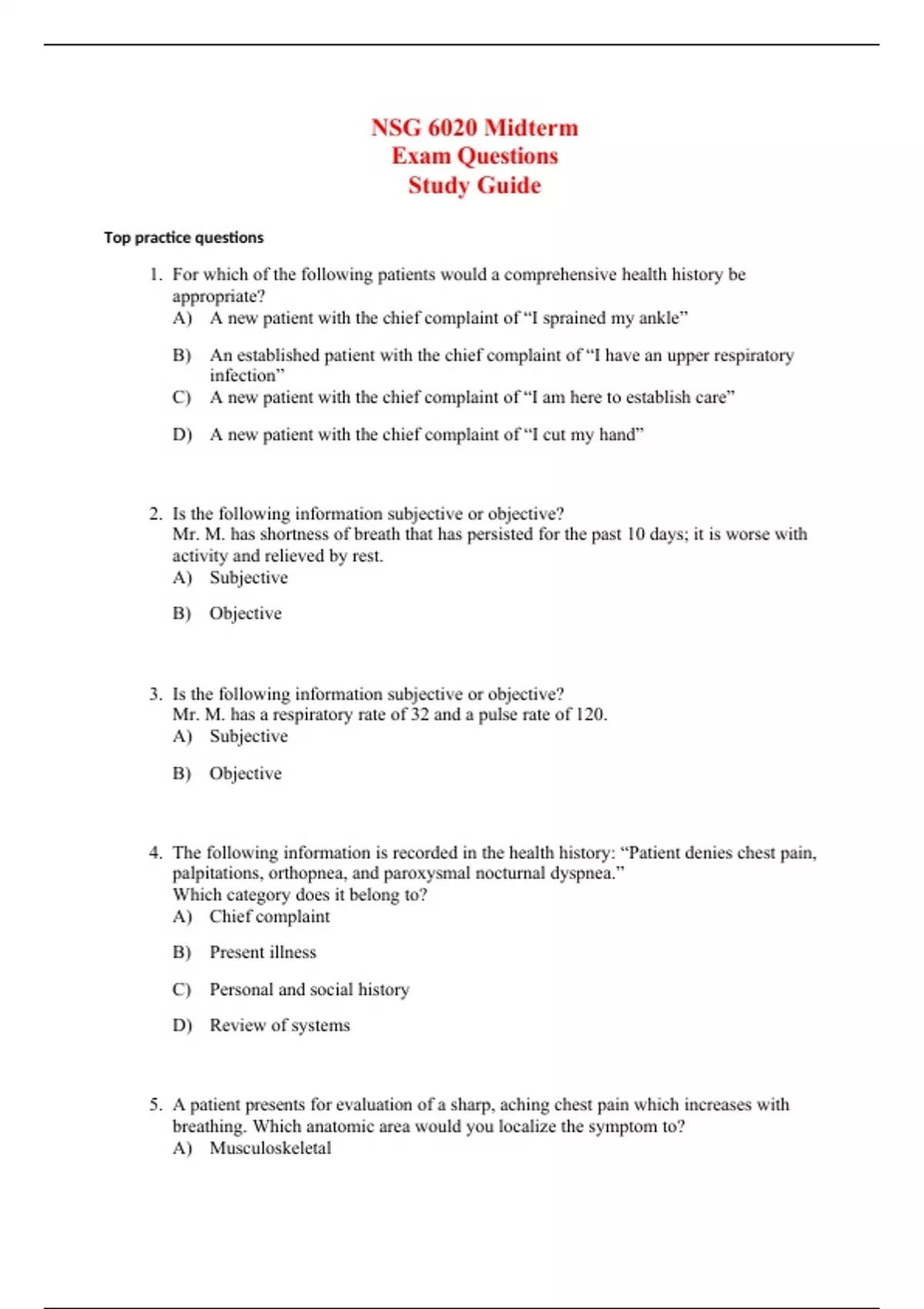 NSG 6020 Midterm Exam Questions Study Guide Top practice questions 1. For which of the following patients would a comprehensive health history be appropriate? A) A new patient with the chief complaint of “I sprained my ankle” B) An established patient with the chief complaint of “I have an upper respiratory infection” C) A new patient with the chief complaint of “I am here to establish care” D) A new patient with the chief complaint of “I cut my hand” 2. Is the following information subjective or objective? Mr. M. has shortness of breath that has persisted for the past 10 days; it is worse with activity and relieved by rest. A) Subjective B) Objective 3. Is the following information subjective or objective? Mr. M. has a respiratory rate of 32 and a pulse rate of 120. A) Subjective B) Objective 4. The following information is recorded in the health history: “Patient denies chest pain, palpitations, orthopnea, and paroxysmal nocturnal dyspnea.” Which category does it belong to? A) Chief complaint B) Present illness C) Personal and social history D) Review of systems 5. A patient presents for evaluation of a sharp, aching chest pain which increases with breathing. Which anatomic area would you localize the symptom to? A) Musculoskeletal B) Reproductive C) Urinary D) Endocrine 6. A 22-year-old advertising copywriter presents for evaluation of joint pain. The pain is new, located in the wrists and fingers bilaterally, with some subjective fever. The patient denies a rash; she also denies recent travel or camping activities. She has a family history significant for rheumatoid arthritis. Based on this information, which of the following pathologic processes would be the most correct? A) Infectious B) Inflammatory C) Hematologic D) Traumatic 7. A 15-year-old high school sophomore comes to the clinic for evaluation of a 3-week history of sneezing; itchy, watery eyes; clear nasal discharge; ear pain; and nonproductive cough. Which is the most likely pathologic process? A) Infection B) Inflammation C) Allergic D) Vascular 8. You are seeing an elderly man with multiple complaints. He has chronic arthritis, pain from an old war injury, and headaches. Today he complains of these pains, as well as dull chest pain under his sternum. What would the order of priority be for your problem list? A) Arthritis, war injury pain, headaches, chest pain B) War injury pain, arthritis, headaches, chest pain C) Headaches, arthritis, war injury pain, chest pain D) Chest pain, headaches, arthritis, war injury pain 9. Suzanne, a 25 year old, comes to your clinic to establish care. You are the student preparing to go into the examination room to interview her. Which of the following is the most logical sequence for the patient–provider interview? A) Establish the agenda, negotiate a plan, establish rapport, and invite the patient's story. B) Invite the patient's story, negotiate a plan, establish the agenda, and establish rapport. C) Greet the patient, establish rapport, invite the patient's story, establish the agenda, expand and clarify the patient's story, and negotiate a plan. D) Negotiate a plan, establish an agenda, invite the patient's story, and establish rapport. 10. Alexandra is a 28-year-old editor who presents to the clinic with abdominal pain. The pain is a dull ache, located in the right upper quadrant, that she rates as a 3 at the least and an 8 at the worst. The pain started a few weeks ago, it lasts for 2 to 3 hours at a time, it comes and goes, and it seems to be worse a couple of hours after eating. She has noticed that it starts after eating greasy foods, so she has cut down on these as much as she can. Initially it occurred once a week, but now it is occurring every other day. Nothing makes it better. From this description, which of the seven attributes of a symptom has been omitted? A) Setting in which the symptom occurs B) Associated manifestations C) Quality D) Timing 11. A 23-year-old graduate student comes to your clinic for evaluation of a urethral discharge. As the provider, you need to get a sexual history. Which one of the following questions is inappropriate for eliciting the information? A) Are you sexually active? B) When was the last time you had intimate physical contact with someone, and did that contact include sexual intercourse? C) Do you have sex with men, women, or both? D) How many sexual partners have you had in the last 6 months? 12. On a very busy day in the office, Mrs. Donelan, who is 81 years old, comes for her usual visit for her blood pressure. She is on a low-dose diuretic chronically and denies any side effects. Her blood pressure is 118/78 today, which is well-controlled. As you are writing her script, she mentions that it is hard not having her husband Bill around anymore. What would you do next? A) Hand her the script and make sure she has a 3-month follow-up appointment. B) Make sure she understands the script. C) Ask why Bill is not there. D) Explain that you will have more time at the next visit to discuss this. 13. When you enter your patient's examination room, his wife is waiting there with him. Which of the following is most appropriate? A) Ask if it's okay to carry out the visit with both people in the room. B) Carry on as you would ordinarily. The permission is implied because his wife is in the room with him. C) Ask his wife to leave the room for reasons of confidentiality. D) First ask his wife what she thinks is going on. 14. You are performing a young woman's first pelvic examination. You make sure to tell her verbally what is coming next and what to expect. Then you carry out each maneuver of the examination. You let her know at the outset that if she needs a break or wants to stop, this is possible. You ask several times during the examination, “How are you doing, Brittney?” What are you accomplishing with these techniques? A) Increasing the patient's sense of control B) Increasing the patient's trust in you as a caregiver C) 