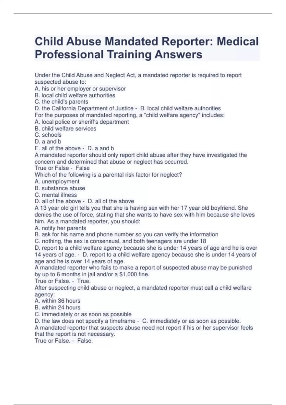 Child Abuse Mandated Reporter: Medical Professional Training Answers Under the Child Abuse and Neglect Act, a mandated reporter is required to report suspected abuse to: A. his or her employer or supervisor B. local child welfare authorities C. the child's parents D. the California Department of Justice - B. local child welfare authorities For the purposes of mandated reporting, a "child welfare agency" includes: A. local police or sheriff's department B. child welfare services C. schools D. a and b E. all of the above - D. a and b A mandated reporter should only report child abuse after they have investigated the concern and determined that abuse or neglect has occurred. True or False - False Which of the following is a parental risk factor for neglect? A. unemployment B. substance abuse C. mental illness D. all of the above - D. all of the above A 13 year old girl tells you that she is having sex with her 17 year old boyfriend. She denies the use of force, stating that she wants to have sex with him because she loves him. As a mandated reporter, you should: A. notify her parents B. ask for his name and phone number so you can verify the information C. nothing, the sex is consensual, and both teenagers are under 18 D. report to a child welfare agency because she is under 14 years of age and he is over 14 years of age. - D. report to a child welfare agency because she is under 14 years of age and he is over 14 years of age. A mandated reporter who fails to make a report of suspected abuse may be punished by up to 6 months in jail and/or a $1,000 fine. True or False. - True. After suspecting child abuse or neglect, a mandated reporter must call a child welfare agency: