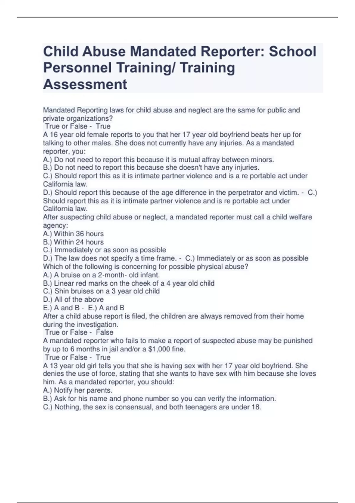 Child Abuse Mandated Reporter: School Personnel Training/ Training Assessment Mandated Reporting laws for child abuse and neglect are the same for public and private organizations? True or False - True A 16 year old female reports to you that her 17 year old boyfriend beats her up for talking to other males. She does not currently have any injuries. As a mandated reporter, you: A.) Do not need to report this because it is mutual affray between minors. B.) Do not need to report this because she doesn't have any injuries. C.) Should report this as it is intimate partner violence and is a re portable act under California law. D.) Should report this because of the age difference in the perpetrator and victim. - C.) Should report this as it is intimate partner violence and is re portable act under California law. After suspecting child abuse or neglect, a mandated reporter must call a child welfare agency: A.) Within 36 hours B.) Within 24 hours C.) Immediately or as soon as possible D.) The law does not specify a time frame. - C.) Immediately or as soon as possible Which of the following is concerning for possible physical abuse? A.) A bruise on a 2-month- old infant. B.) Linear red marks on the cheek of a 4 year old child C.) Shin bruises on a 3 year old child D.) All of the above E.) A and B - E.) A and B After a child abuse report is filed, the children are always removed from their home during the investigation. True or False - False A mandated reporter who fails to make a report of suspected abuse may be punished by up to 6 months in jail and/or a $1,000 fine. True or False - True A 13 year old girl tells