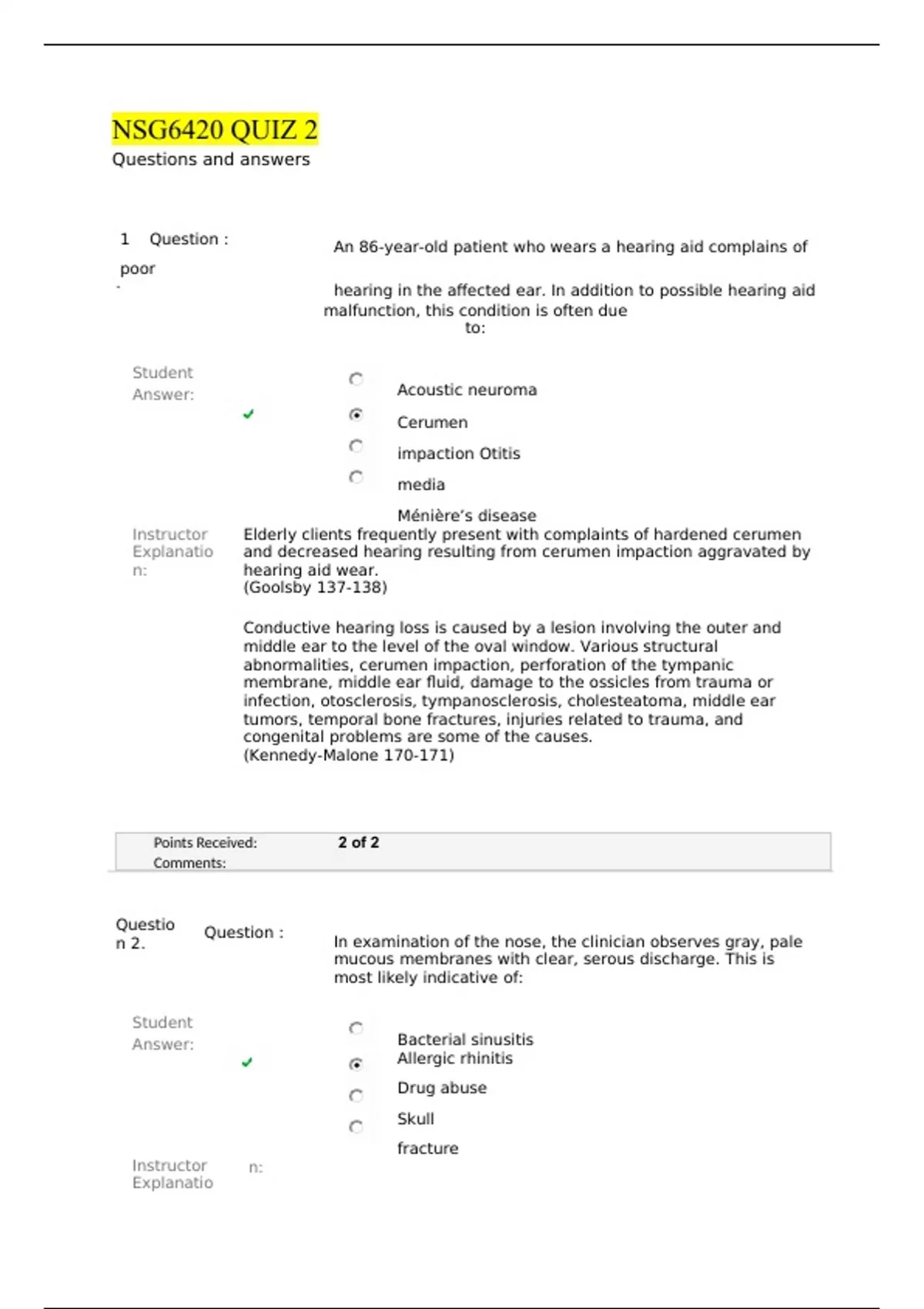 NSG6420 QUIZ 2 Questions and answers 1 Question : An 86-year-old patient who wears a hearing aid complains of poor . hearing in the affected ear. In addition to possible hearing aid malfunction, this condition is often due to: Student Answer: Acoustic neuroma Cerumen impaction Otitis media Ménière’s disease Instructor Explanation: Elderly clients frequently present with complaints of hardened cerumen and decreased hearing resulting from cerumen impaction aggravated by hearing aid wear. (Goolsby 137-138) Conductive hearing loss is caused by a lesion involving the outer and middle ear to the level of the oval window. Various structural abnormalities, cerumen impaction, perforation of the tympanic membrane, middle ear fluid, damage to the ossicles from trauma or infection, otosclerosis, tympanosclerosis, cholesteatoma, middle ear tumors, temporal bone fractures, injuries related to trauma, and congenital problems are some of the causes. (Kennedy-Malone 170-171) Question 2. Question : In examination of the nose, the clinician observes gray, pale mucous membranes with clear, serous discharge. This is most likely indicative of: Student Answer: Bacterial sinusitis Allergic rhinitis Drug abuse Skull fracture Instructor Explanation: When examining the nose, assess the mucosa for integrity, color, moistness, and edema/lesions and the nasal septum for patency. The turbinates should be assessed for color and size. Pale, boggy turbinates suggest allergies; erythematous, swollen turbinates are often seen with infection. Any discharge should be noted. Clear, profuse discharge is often associated with allergies. (Goolsby 128-129) Patients with seasonal allergic rhinitis report rhinorrhea, sneezing, obstructed nasal passages, and pruritic eyes, nose, and oropharynx during the spring and fall. Patients with perennial allergic rhinitis have similar symptoms associated with exposure to environmental allergens typically in their homes. Physical examination may reveal a pale, boggy nasal mucosa, injected conjunctiva, enlarged turbinates, dark discoloration or bags under the eyes, and mouth breathing; absence of pale, boggy nasal mucosa does not rule out allergic rhinitis. (Kennedy-Malone 182-183) Question 3. Question : A 45 year old patient presents with ‘sore throat’ and fever for one week. After a quick strep screen you determine the patient has Strep throat. You know that streptococcal pharyngitis should be treated with antibiotics to prevent complications and to shorten the course of disease. Which of the following antibiotics should be considered when a patient is allergic to Penicillin? Student Answer: Instructor Explanation: Amoxicillin EES (erythromycin) Bicillin L-A Dicloxacillin MedU Card #1 Question 4. Question : Presbycusis is the hearing impairment that is associated with: Student Answer: Physiologic aging Ménière’s disease Cerumen impaction Herpes zoster Instructor Explanation: Presbycusis is an age-related cause of gradual sensorineural hearing loss and involves diminished hairy cell function within the cochlea as well as decreased elasticity of the TM. Although the changes associated with presbycusis often start in early adulthood, the decreased hearing acuity is usually not noticed until the individual is older than 65. (Goolsby 138) Because presbycusis is gradual and insidious, hearing loss may go unnoticed until it has progressed significantly. (Kennedy-Malone 170) Question 5. Question : Epistaxis can be a symptom of: Student Answer: Over-anticoagulation Hematologic malignancy Cocaine abuse All of the above Instructor Explanation: Cocaine abuse, which is more common than might be expected, frequently causes epistaxis. Hematologic disorders likely to cause bleeding include thrombocytopenia, leukemia, aplastic anemia, and hereditary coagulopathies. High doses of anticoagulants can cause epistaxis and bleeding from the gums. (Goolsby 142) Epistaxis results from a spontaneous rupture of a blood vessel in the nose, usually in the anterior septum in Kiesselbach's plexus (Nguyen, 2012). The bleeding may be secondary to local infections, systemic infections, drying of the nasal mucous membrane, trauma, arteriosclerosis, hypertension, or bleeding disorders. Trauma is usually the primary mechanism of disruption of the nasal mucosa. Posterior epistaxis can result in nausea and respiratory compromise. In older adults, nasal and paranasal tumors may be involved (Mäkitie, 2010). (Kennedy-Malone 168-169) Question 6. Question : Your patient has been using chewing tobacco for 10 years. On physical examination, you observe a white ulceration surrounded by erythematous base on the side of his tongue. The clinician should recognize that very often this is: Student Answer: Malignant melanoma Squamous cell carcinoma Instructor Explanation: Aphthous ulceration Behcet’s syndrome Most oral malignancies are painless until quite advanced, so patients are often unaware of the lesion unless the lip or anterior portion of the tongue is involved. The patient may become aware of the lesion if it bleeds. Squamous cell cancer lesions vary in appearance, from the reddened patches of erythroplakia to areas of induration/thickening, ulceration, or necrotic lesions. Lesions of malignant melanoma have varied pigmentation, including brown, blue, and black. Even lesions that appear flat and smooth may be nodular, indurated, or fixed to adjacent tissue on palpation. Even though patients with squamous cell malignancies often have a history of heavy alcohol and/or tobacco use or poor dentition, these are not risk factors for malignant melanoma. In Behcet’s syndrome, the patient complains of recurrent episodes of oral lesions that are consistent with aphthous ulcers. The number of lesions ranges from one to several; the size of the ulcers varies from less than to greater than 1 cm. Like aphthous ulcers, the lesions are well defined, with a pale yellow or gray base surrounded by erythema. The majority of patients also 