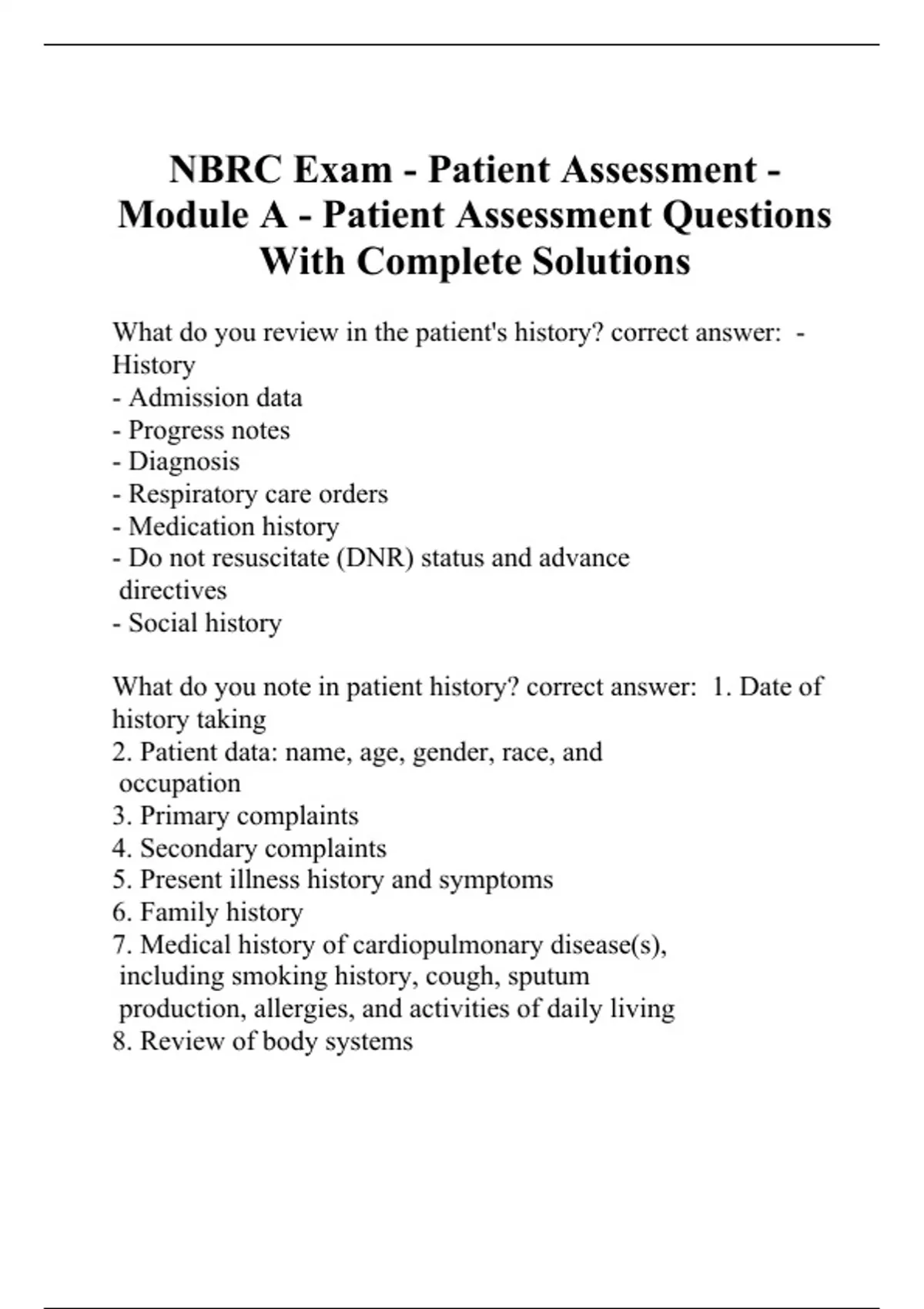 NBRC Exam - Patient Assessment - Module A - Patient Assessment Questions With Complete Solutions