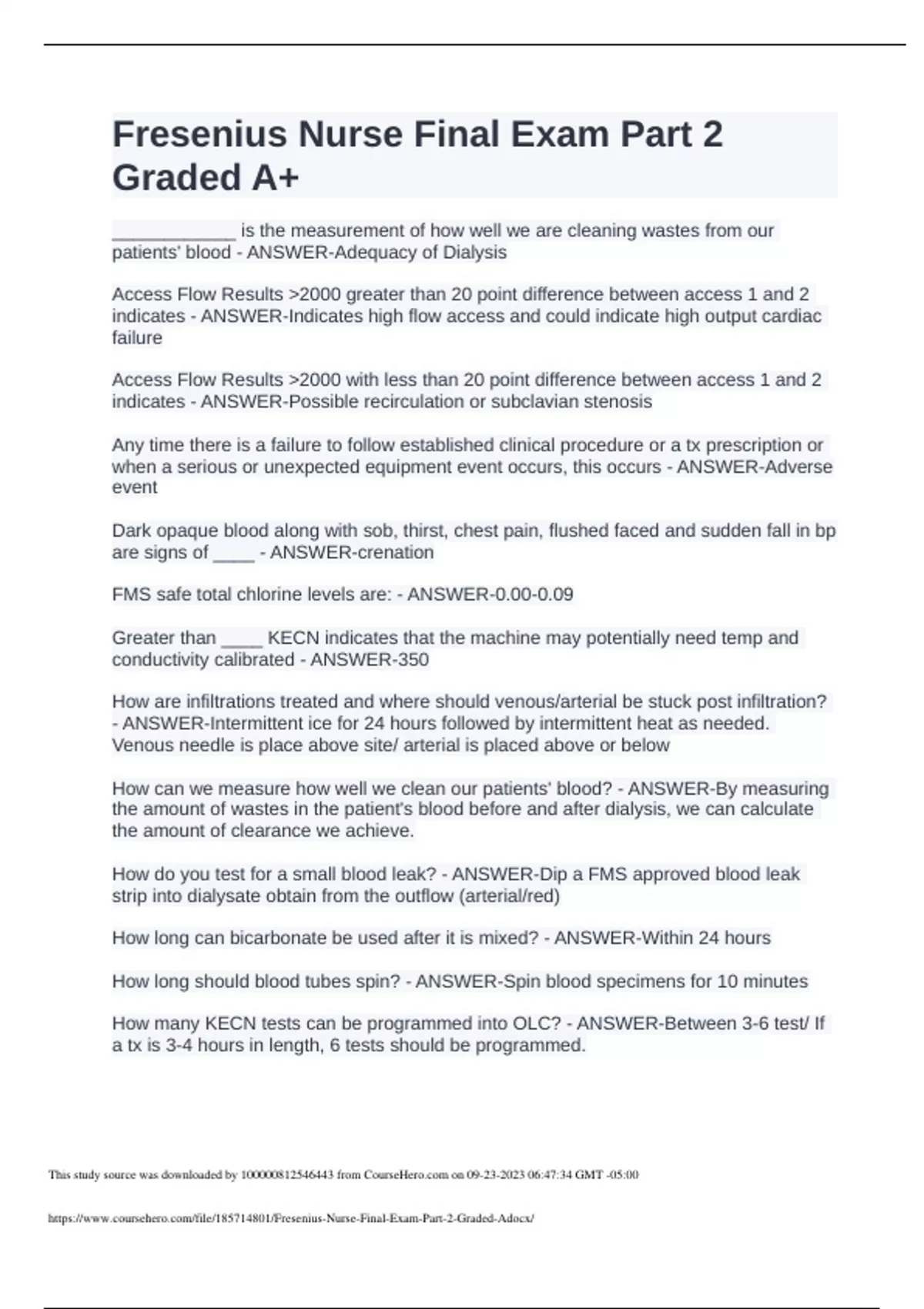 Fresenius Nurse Final Exam Part 2 Graded A+