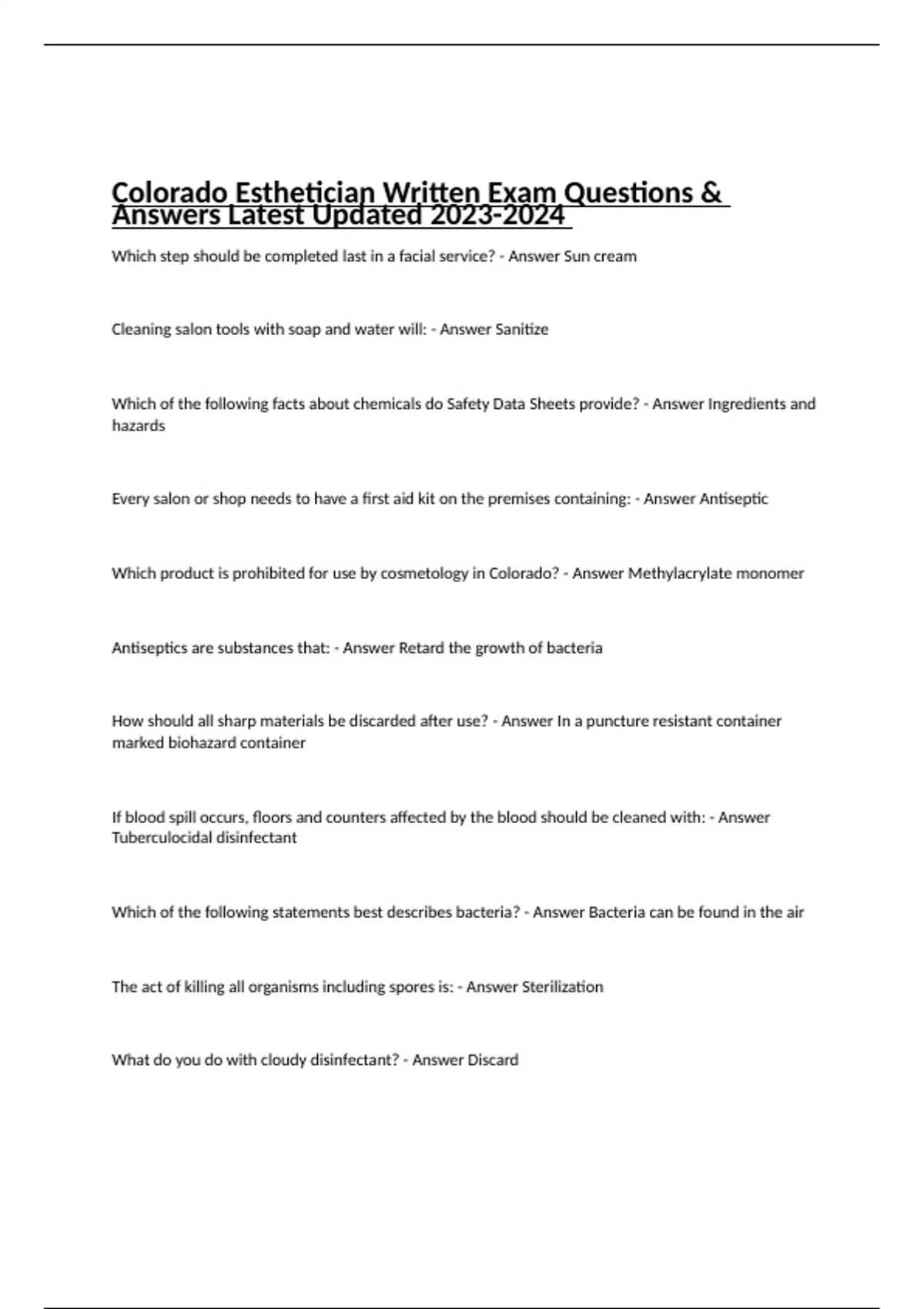 Colorado Esthetician Written Exam Questions & Answers Latest Updated