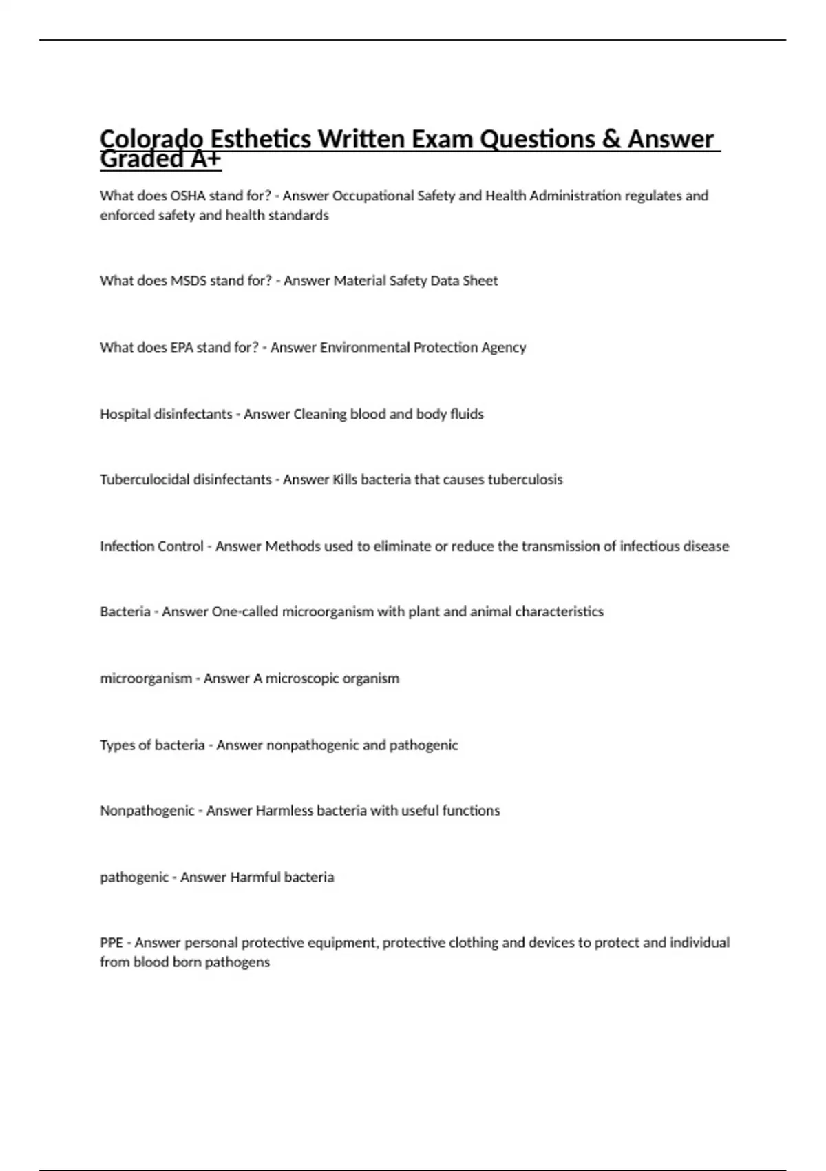 Colorado Esthetics Written Exam Questions & Answer Graded A+