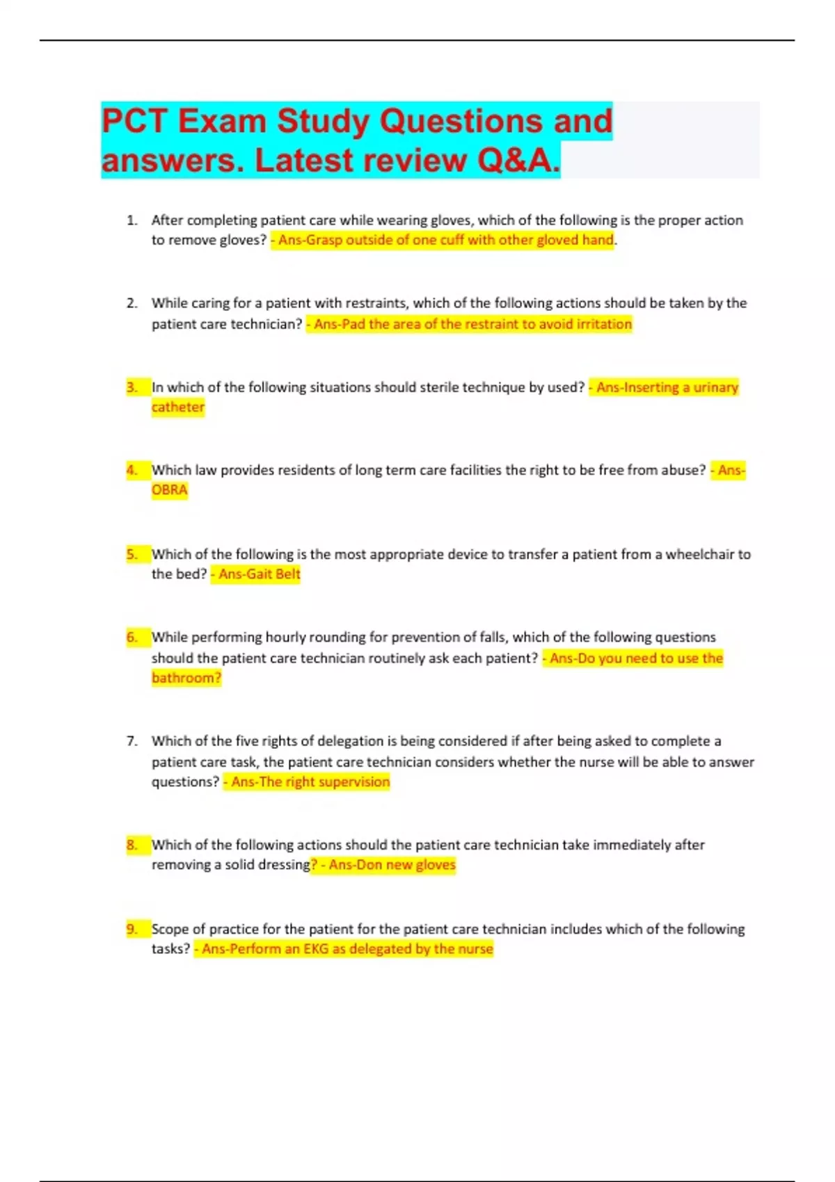 After completing patient care while wearing gloves, which of the following is the proper action to remove gloves? - Ans-Grasp outside of one cuff with other gloved hand. 2. While caring for a patient with restraints, which of the following actions should be taken by the patient care technician? - Ans-Pad the area of the restraint to avoid irritation 3. In which of the following situations should sterile technique by used? - Ans-Inserting a urinary catheter 4. Which law provides residents of long term care facilities the right to be free from abuse? - AnsOBRA