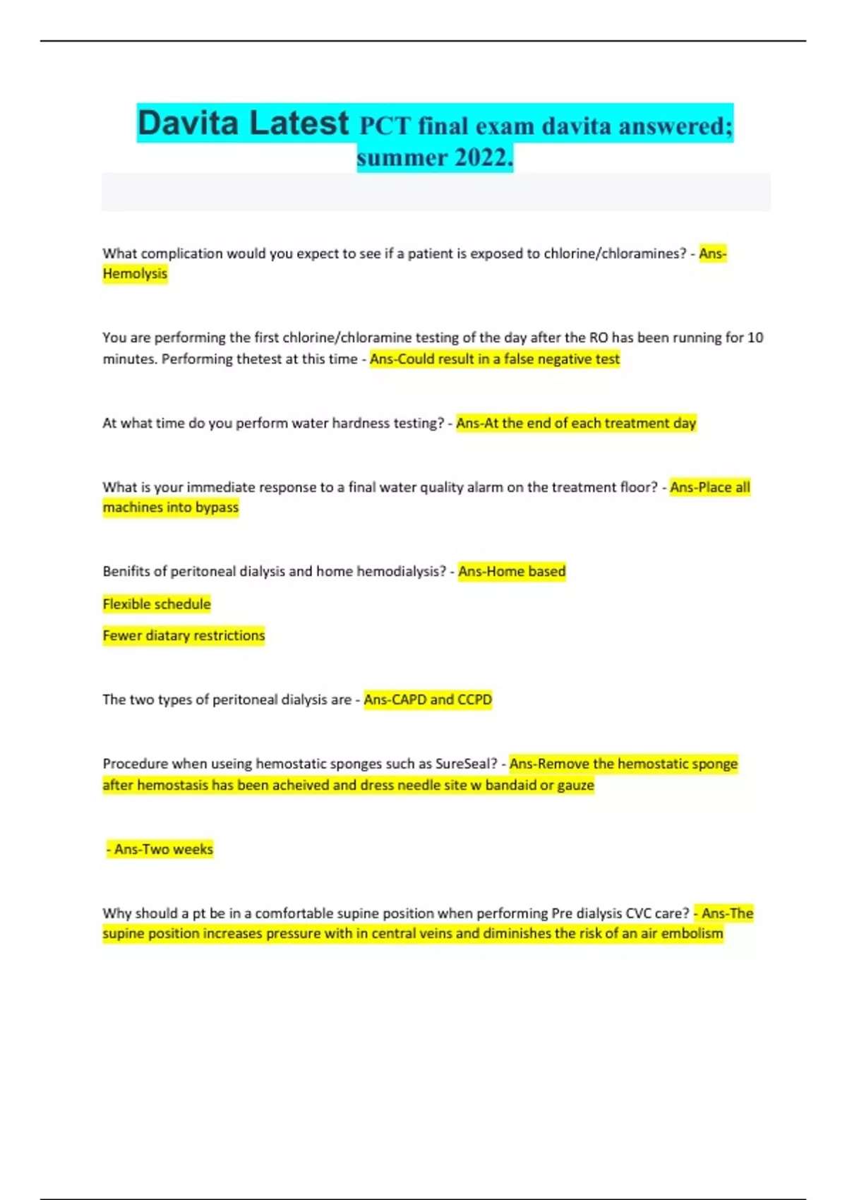 What complication would you expect to see if a patient is exposed to chlorine/chloramines? - AnsHemolysis You are performing the first chlorine/chloramine testing of the day after the RO has been running for 10 minutes. Performing thetest at this time - Ans-Could result in a false negative test At what time do you perform water hardness testing? - Ans-At the end of each treatment day What is your immediate response to a final water quality alarm on the treatment floor? - Ans-Place all machines into bypass