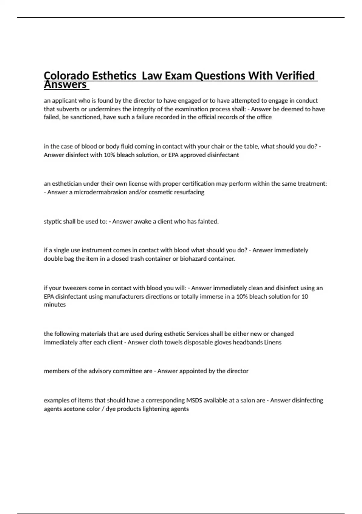 Colorado Esthetics Law Exam Questions With Verified Answers