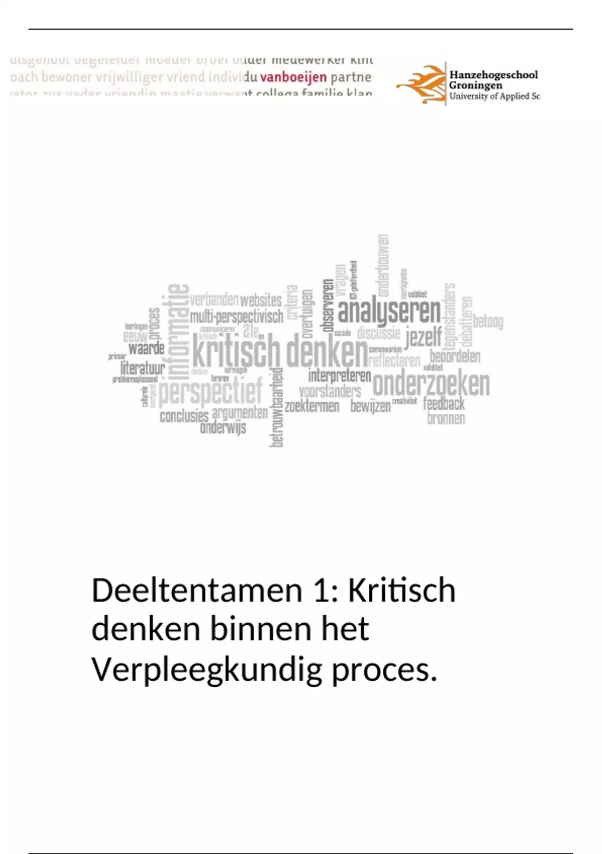 Voor u ligt de uitwerking van het deeltentamen Kritisch denken binnen het verpleegkundig proces.