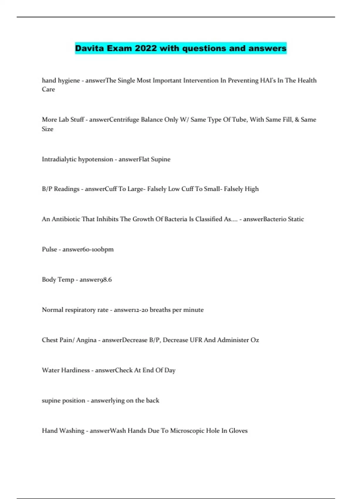 hand hygiene - answerThe Single Most Important Intervention In Preventing HAI's In The Health Care More Lab Stuff - answerCentrifuge Balance Only W/ Same Type Of Tube, With Same Fill, & Same Size Intradialytic hypotension - answerFlat Supine B/P Readings - answerCuff To Large- Falsely Low Cuff To Small- Falsely High An Antibiotic That Inhibits The Growth Of Bacteria Is Classified As.... - answerBacterio Static Pulse - answer60-100bpm