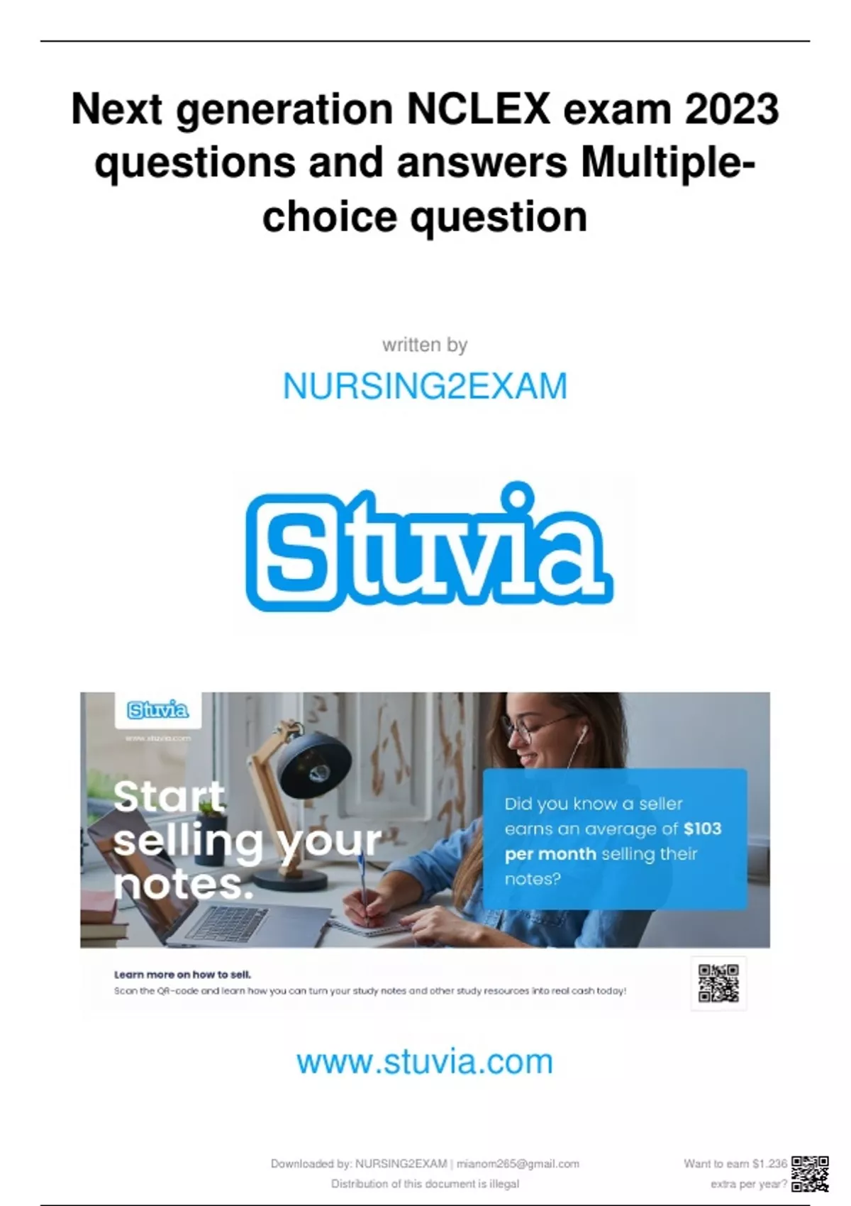 Test Bank for Physical Examination and Health Assessment 9th Edition by Carolyn Jarvis, Ann Eckhardt / All Chapters 1-32 / Full Complete LATEST chapter 1-32 100%CORRECT AND VERIFIED QUESTIONS AND ANSWERS written by NURSING2EXAM Downloaded by: NURSING2EXAM | Distribution of this document is illegal Want to earn $1.236 extra per year? Test Bank for Physical Examination and Health Assessment 9th Edition by Carolyn Jarvis, Ann Eckhardt / All Chapters 1-32 / Full Complete 2023 - 2024 LATEST chapter 1-32 100%CORRECT AND VERIFIED QUESTIONS AND ANSWERS Chapter 01: Evidence-Based Assessment MULTIPLE CHOICE 1. After completing an initial assessment of a patient, the nurse has charted that his respirations are eupneic and his pulse is 58 beats per minute. These types of data would be: a. Objective. b. Reflective. c. Subjective. d. Introspective. ANS: A Objective data are what the health professional observes by inspecting, percussing, palpating, and auscultating during the physical examination. Subjective data is what the person says about him or herself during history taking. The terms reflective and introspective are not used to describe data. DIF: Cognitive Level: Understanding (Comprehension) MSC: Client Needs: Safe and Effective Care Environment: Management of Care 2. A patient tells the nurse that he is very nervous, is nauseated, and feels hot. These types of data would be: a. Objective. b. Reflective. c. Subjective. d. Introspective. ANS: C Subjective data are what the person says about him or herself during history taking. Objective data are what the health professional observes by inspecting, percussing, palpating, and auscultating during the physical examination. The terms reflective and introspective are not used to describe data. S - The Marketplace to Buy and Sell your Study Material Downloaded by: NURSING2EXAM | Distribution of this document is illegal Want to earn $1.236 extra per year? S - The Marketplace to Buy and Sell your Study Material DIF: Cognitive Level: Understanding (Comprehension) MSC: Client Needs: Safe and Effective Care Environment: Management of Care 3. The patients record, laboratory studies, objective data, and subjective data combine to form the: a. Data base. b. Admitting data. Downloaded by: NURSING2EXAM | Distribution of this document is illegal Want to earn $1.236 extra per year? S - The Marketplace to Buy and Sell your Study Material c. Financial statement. d. Discharge summar