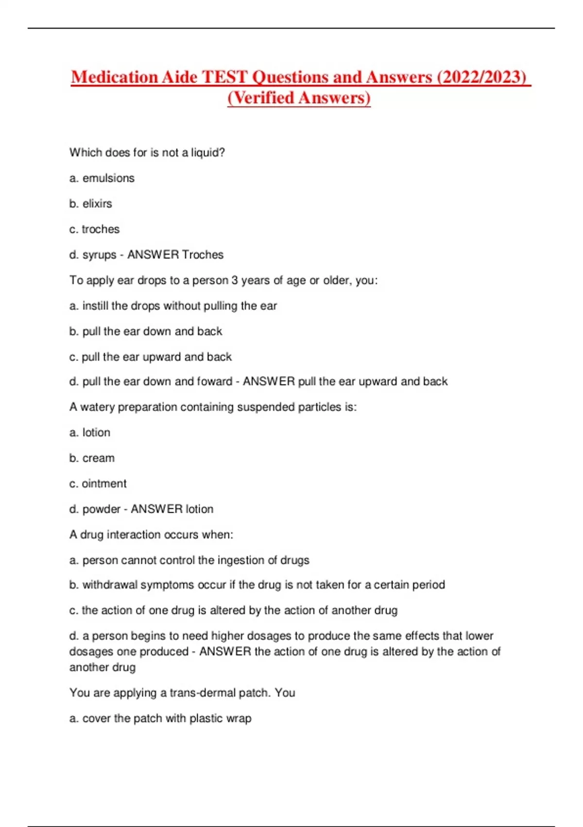 Which does for is not a liquid?a. emulsionsb. elixirsc. trochesd. syrups - ANSWER Troches To apply ear drops to a person 3 years of age or older, you:a. instill the drops without pulling the earb. pull the ear down and backc. pull the ear upward and backd. pull the ear down and foward - ANSWER pull the ear upward and backA watery preparation containing suspended particles is:a. lotionb. creamc. ointment d. powder - ANSWER lotionA drug interaction occurs when:a. person cannot control the ingestion of drugsb. withdrawal symptoms occur if the drug is not taken for a certain periodc. the action of one drug is altered by the action of another drugd. a person begins to need higher dosages to produce the same effects that lowerdosages one produced - ANSWER the action of one drug is altered by the action ofanother drugYou are applying a trans-dermal patch. Youa. cover the patch with plastic wrap