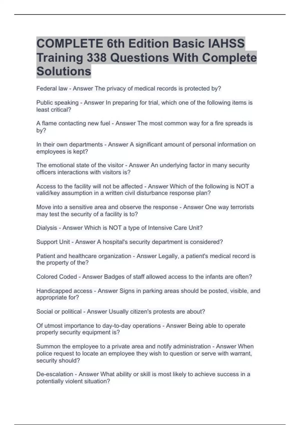 COMPLETE 6th Edition Basic IAHSS Training 338 Questions With Complete Solutions