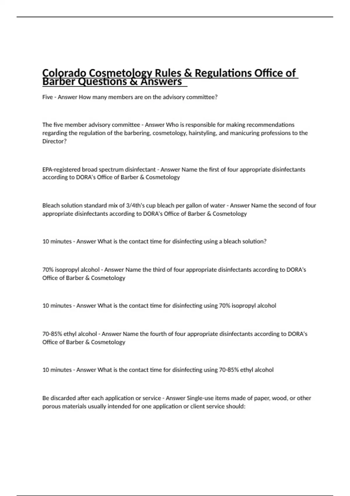 Five - Answer How many members are on the advisory committee? The five member advisory committee - Answer Who is responsible for making recommendations regarding the regulation of the barbering, cosmetology, hairstyling, and manicuring professions to the Director? EPA-registered broad spectrum disinfectant - Answer Name the first of four appropriate disinfectants according to DORA's Office of Barber & Cosmetology Bleach solution standard mix of 3/4th's cup bleach per gallon of water - Answer Name the second of four appropriate disinfectants according to DORA's Office of Barber & Cosmetology 10 minutes - Answer What is the contact time for disinfecting using a bleach solution? 70% isopropyl alcohol - Answer Name the third of four appropriate disinfectants according to DORA's Office of Barber & Cosmetology 10 minutes - Answer What is the contact time for disinfecting using 70% isopropyl alcohol 70-85% ethyl alcohol - Answer Name the fourth of four appropriate disinfectants according to DORA's Office of Barber & Cosmetology 10 minutes - Answer What is the contact time for disinfecting using 70-85% ethyl alcohol Be discarded after each application or service - Answer Single-use items made of paper, wood, or other porous materials usually intended for one application or client service should: EPA-registered broad spectrum disinfectant, isopropyl alcohol, ethyl alcohol, or bleach solution - Answer Electrical equipment that cannot be immersed in liquid should be brushed and wiped or sprayed with what immediately after each client? Puncture resistant container marked with a biohazard symbol - Answer Lancets, disposable razors, and other sharp objects must be disposed of in what after each client? Wash hands with soap and water or use waterless hand sanitizer - Answer Before providing any client service, estheticians must do what?