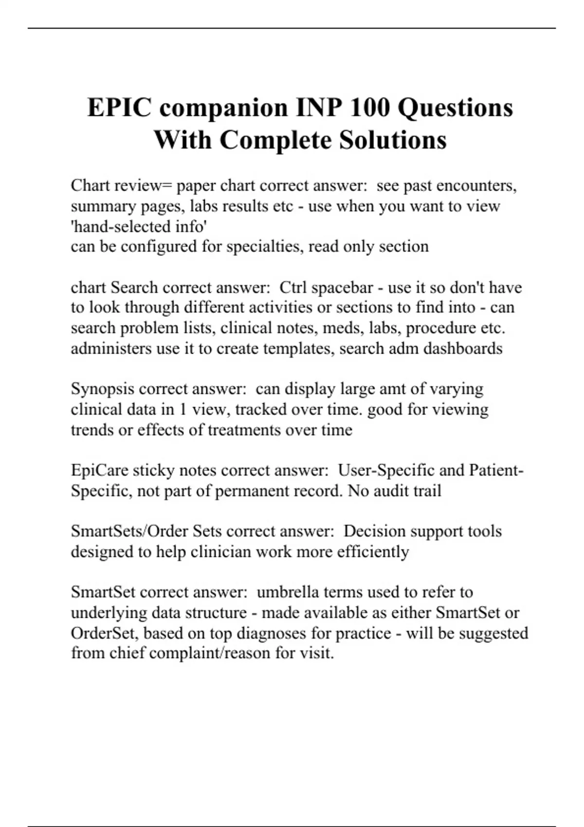 Chart review= paper chart correct answer: see past encounters, summary pages, labs results etc - use when you want to view 'hand-selected info' can be configured for specialties, read only section chart Search correct answer: Ctrl spacebar - use it so don't have to look through different activities or sections to find into - can search problem lists, clinical notes, meds, labs, procedure etc. administers use it to create templates, search adm dashboards Synopsis correct answer: can display large amt of varying clinical data in 1 view, tracked over time. good for viewing trends or effects of treatments over time EpiCare sticky notes correct answer: User-Specific and Patient-Specific, not part of permanent record. No audit trail SmartSets/Order Sets correct answer: Decision support tools designed to help clinician work more efficiently SmartSet correct answer: umbrella terms used to refer to underlying data structure - made available as either SmartSet or OrderSet, based on top diagnoses for practice - will be suggested from chief complaint/reason for visit. Cascading in a flow sheet correct answer: when select an item, additional items open up for more options/choices Preference List correct answer: list of recommended or preferred items, such as medications or reasons for visit. user and sytem preference lists. Startup Activity correct answer: Epic term: first screen user sees when they log in. 2-5 My List correct answer: Current patient assignments for shift. Can add System list to My List 2-7 System List correct answer: lists of patients based on a specified set of criteria that clinicians use to track their patient assignments. (updated by system) 2-7 (physician 9-11) Activities correct answer: Tabs along the left of the screen in a patient's chart Report Toolbar correct answer: Quick access to variety of "reports" in each activity tab. (in upper toolbar above "Summary activity") 2-11 Handoff (Beyond the Basics) correct answer: Report tool used in "Patient Lists" (click on "Write Handoff") allowing practices to update patient's status. (Summary, To Do, To Do-On Call) Auto populates basic assessments. 2-14 How do you know which Notes are new? correct answer: Clock Icon in column next to note. 3-6 Cosign/Attest correct answer: Physician's approval of resident/practitioner note by clicking on "Attest." ...order by cosigning. (original author remains) 3-9 (can attest rega