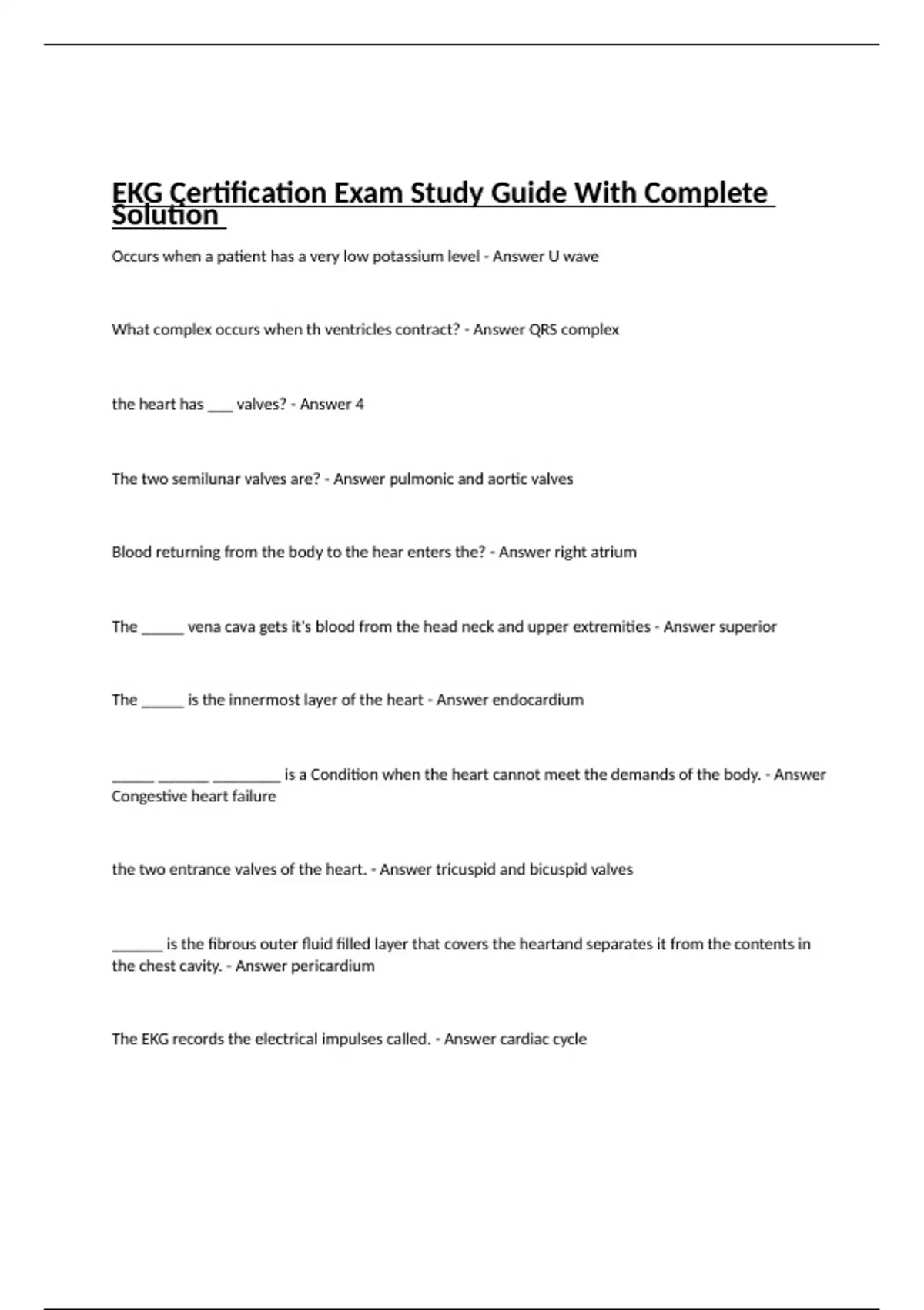 Occurs when a patient has a very low potassium level - Answer U wave What complex occurs when th ventricles contract? - Answer QRS complex the heart has ___ valves? - Answer 4 The two semilunar valves are? - Answer pulmonic and aortic valves Blood returning from the body to the hear enters the? - Answer right atrium