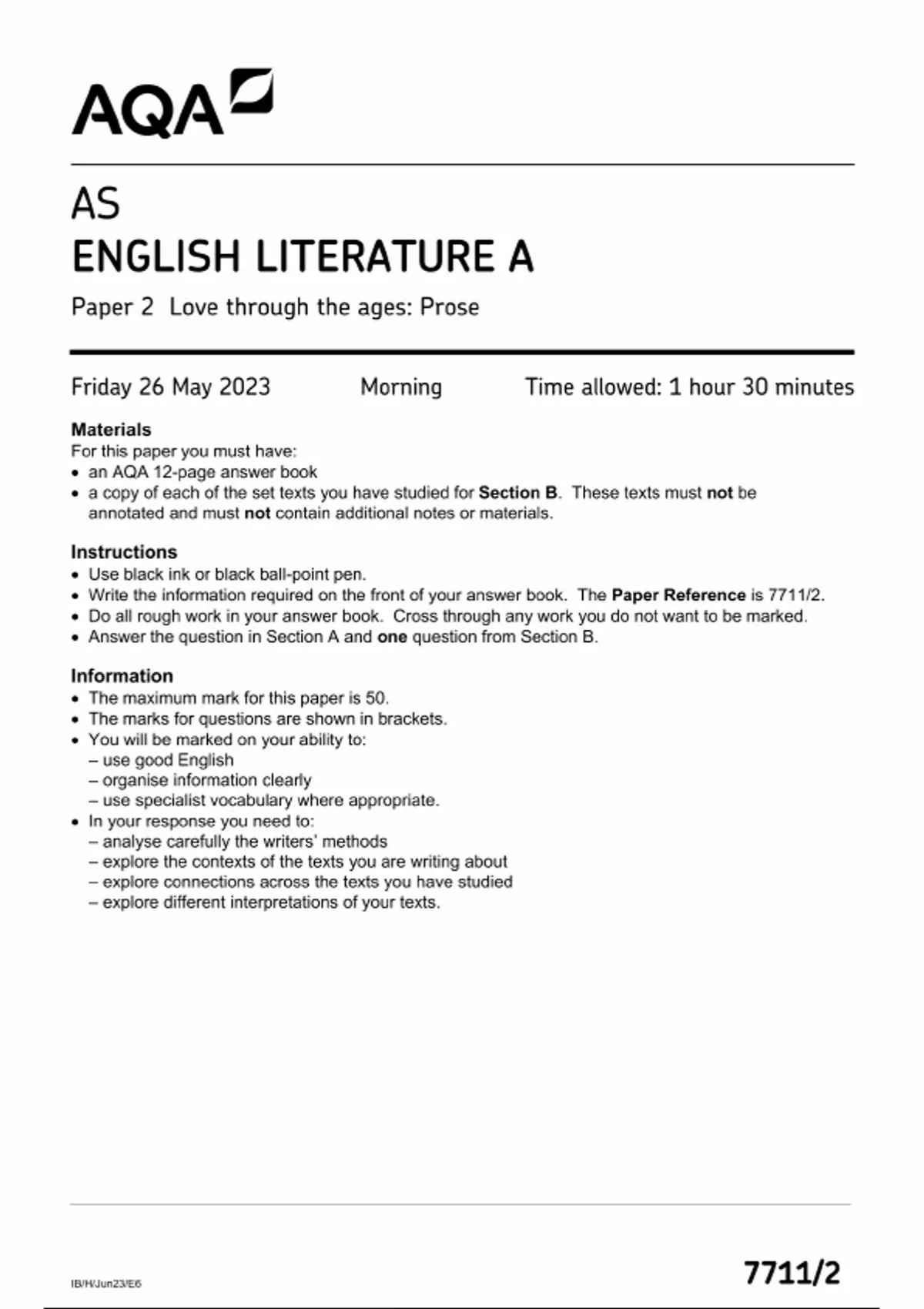 AQA AS ENGLISH LITERATURE A PAPER 2 MAY 2023 QUESTION PAPER (7711-2:ove through the ages Prose)