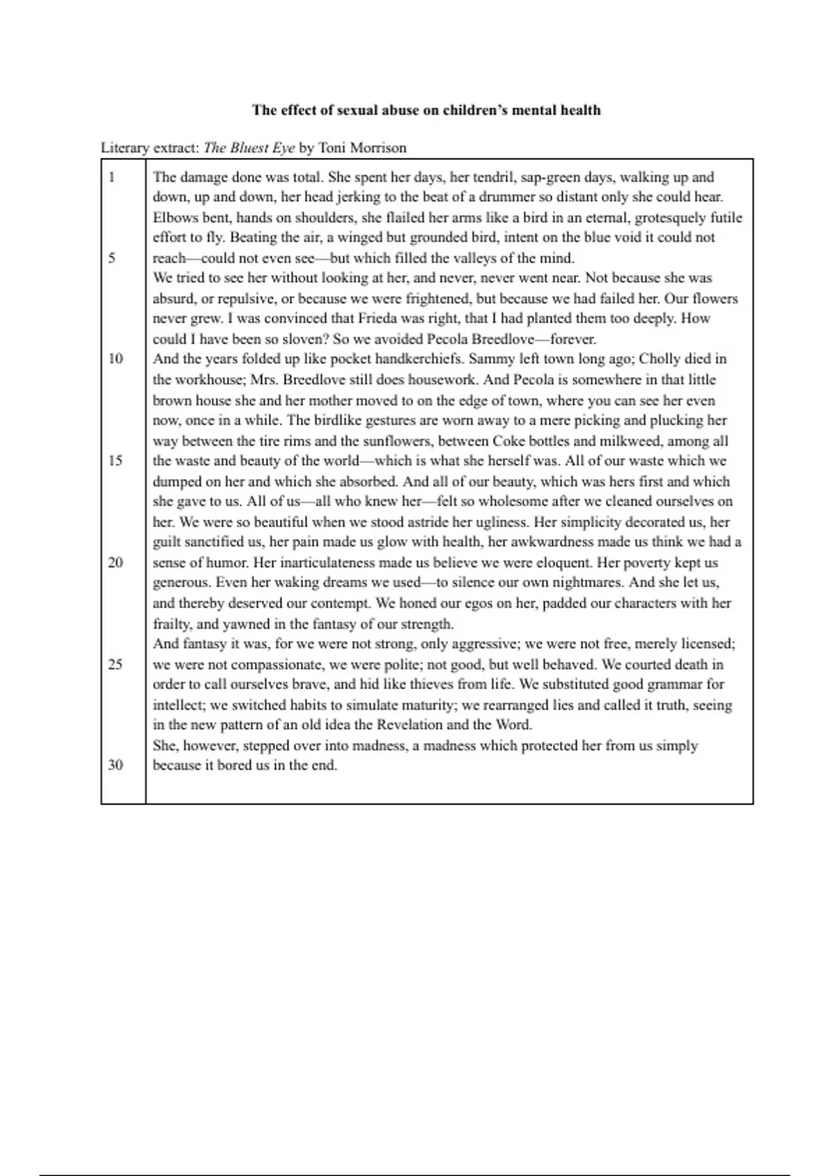 Extracts used in Individual Oral which received grade 6 in May 2023. The topic is "The effect of sexual abuse on children’s mental health." Includes extracts from "The Bluest Eye" by Toni Morrison and "Precious" by Lee Daniels.