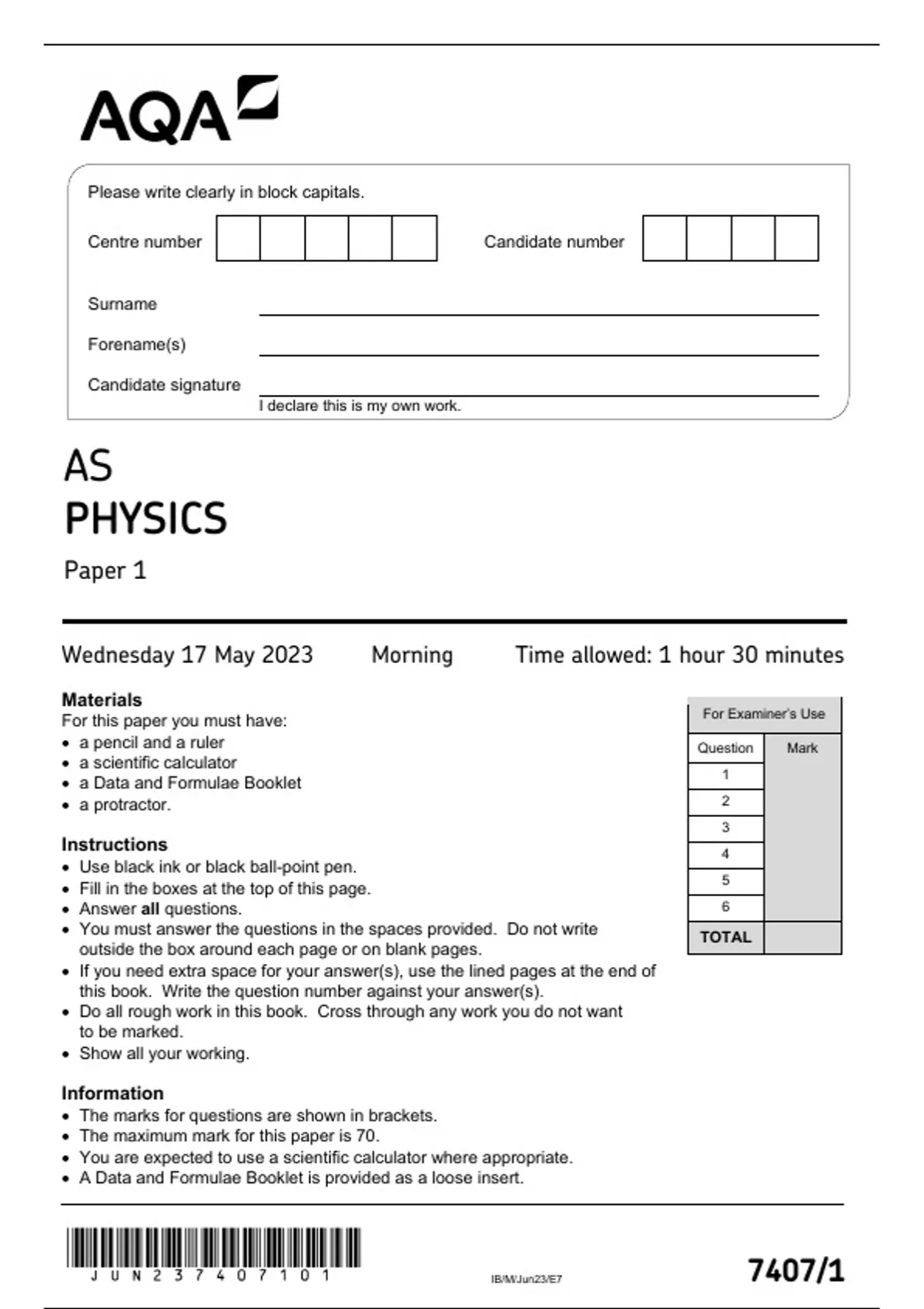 AQA AS PHYSICS PAPER 1 MAY 2023 QUESTION PAPER (7407-1)