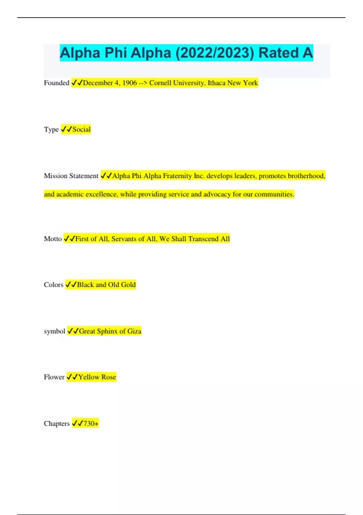 Alpha Phi Alpha (2022/2023) Rated A Founded December 4, 1906 --> Cornell University, Ithaca New York Type Social Mission Statement Alpha Phi Alpha Fraternity Inc. develops leaders, promotes brotherhood, and academic excellence, while providing service and advocacy for our communities. Motto First of All, Servants of All, We Shall Transcend All Colors Black and Old Gold symbol Great Sphinx of Giza Flower Yellow Rose Chapters 730+ Members 290,000+ lifetime Factoid The first inter-collegiate Gree-letter organization established for African Americans. Aims Manly Deeds, Scholarship, and Love for All Mankind Headquarters Baltimore, Maryland, United States Founders are known as: the "Seven Jewels" Preserved Archives Moorland-Spingarn Research Center Where are chapters charted? Howard University and Virginia Union University in 1907 Active chapters located ? Americas, Africa, Europe, the Caribbean, and Asia Alpha Phi Alpha evolved into a primarily service organization and provided leadership and service during : Great Depression, World Wars, and Civil Rights Movements It addresses social issues such as: apartheid, AIDS, urban housing, and other economic, cultural, and political issues of interest to people of color. Programs of Alpha Phi Alpha The Martin Luther King, Jr. National Memorial and World Policy Council. March of Dimes, Head Start, Boy Scouts of America, and Big Brothers Big Sisters of America. Members of Alpha Phi Alpha include: (not the founder) Jamaican Prime Minister Norman Manley, Nobel Prize winner Martin Luther King, Jr., Olympian Jesse Owens, Justice Thurgood Marshall, United Nations Ambassador Andrew Young, Singer Lionel Richie and Atlanta Mayor Maynard Jackson. Preamble To promote a more perfect union among college men; to aid in and insist upon the personal progress of its members; to further brotherly love and a fraternal spirit within the organization; to discountenance evil; to destroy all prejudices; to preserve the sanctity of the home, the personification of virtue and the chastity of woman. Omega The End . Deceased brothers are said to have joined Omega Chapter. Founders Jones and Murray chartered the second and third chapters, at: Howard University and Virginia Union University, respectively, in December 1907. The charter at __________made it the site of the organization of the first black Greek letter organization among historically black colleges Howard University The purpose and objective of the fraternity within the articles of incorporation were declared : "educational and for the mutual uplift of its members." The fraternity chartered its first international chapter at: University of Toronto in 1908 The first general convention assembled in December 1908 at: Howard University in Washington D.C The First General Covention producing the first ritual and the election of the first General President of Alpha Phi Alpha, Moses A. Morrison. First General President of Alpha Phi Alpha Moses A. Morrison Each newly elected General President is automatically considered : "100 most influential Black Americans." The fraternity established its first alumni chapter Alpha Lambda in: 1911 in Louisville, Kentucky Incorporated as a national organization on April 9, 1911 under the laws of Congress within the District of Columbia, under the name and title of The Alpha Phi Alpha Fraternity.