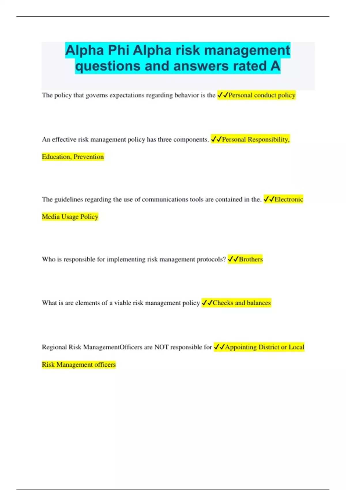 Alpha Phi Alpha risk management questions and answers rated A