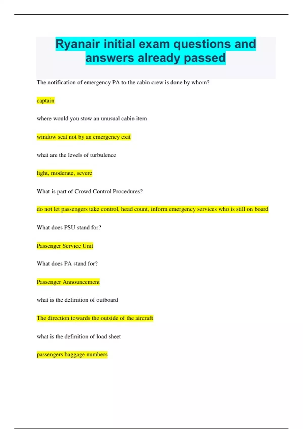 Ryanair initial exam questions and answers already passed The notification of emergency PA to the cabin crew is done by whom? captain where would you stow an unusual cabin item window seat not by an emergency exit what are the levels of turbulence light, moderate, severe What is part of Crowd Control Procedures? do not let passengers take control, head count, inform emergency services who is still on board What does PSU stand for? Passenger Service Unit What does PA stand for? Passenger Announcement what is the definition of outboard The direction towards the outside of the aircraft what is the definition of load sheet passengers baggage numbers what is the definition of landing gear The wheels and associated components on which the aircraft lands. Also called the undercarriage what is the definition of inboard The direction towards the centre line of the aircraft what is the definition of infant A person under the age of 2 years what is the definition of hold A compartment in the lower deck where baggage and cargo is stowed What does GPU stand for general power unit how much time do we have to fully evacuate an aircraft 90 seconds what should you consider when stowing an unusual item of cabin luggage passenger must be seated next to it, secure with extension seatbelt and must be 18cm from psu How long is the Ryanair turnaround? 25 minutes which command will be used if the slide needs to be used as an apron slide sit and slide which command will be used when the slide is fully inflated during an evacuation on land jump and slide what will NO2 do on hearing 'NO1 to flight deck' stow trolleys to front of aircraft and wait for NITS briefing from NO1 what information should be given to rescue services after evacuation headcount and whose left on board Who are suitable ABPs? (6) Police office; Fire crew; Aircrew; Ambulance Crew; Military personnel; Doctors and nurses who are not suitable to be an ABP depotee prisoner passenger travelling with infant passenger with extended seatbelt under 16 what does PAA stand for Problem, Action, Additional Information A time Available Short Notice can be up to? 5 minutes What does NITS stand for? Nature, Intentions, Time, Special instructions How does the flight crew notify an emergency to the CC? interphone what is the maximum number of infants allowed on a boeing 737-800 aircraft 18-35 when should the safety demonstration start if headcount is not required by the captain when all passengers are seated what is the procedure for severe turbulence Discontinue the cabin service immediately; Place the hot drinks on the floor; Set breakers on all trolleys at present location; Take the nearest available seat; When able Flight Crew will make a PA. When would CC carry out Cabin secure checks? Before take off Before landing examples of galley secure checks galley curtains are open ovens are clean and turned off trolleys are stored examples of toilet secure checks no passengers are in there no bags are left smoke detector intact gash bags are in there toilet doors are locked Are infants included in THOB? yes how often should cc call the flight deck to monitor their well-being every 20 minutes what is the restriction in relation to uncomplicated single pregnancies 28-36 weeks they require a fit to fly form 36 weeks unable to fly who can occupy a direct access seat passenger willing to help in an emergency When should CC conduct PDI's? The first flight of the day / change of aircraft contributing factor to safety on the ramp wearing a HiViz When should CC complete their 30 second review? During take off and landing Why are the lights dimmed for take off and landing in the hours of darkness? to adjust the eyes to the darkness What does FOD stand for? Foreign Object Damage what is the definition of taxiway Airport routes linking runway with the ramp area. what is the definition of stand Parking area for aircraft what is the definition of taxiing All aircraft movements on the ground, following landing and prior to take-off. What does SOP stand for? Standard Operating Procedure what is the definition of runway Airport area designed for aircraft to take-off and land. what is the definition of ramp Manoeuvring area for aircraft beside/next to the terminal building what is the definition of girt bar Metal bar which connects to brackets on the floor when the aircraft slide is armed what is the definition of girt apron Piece of heavy material which connects the evacuation device to the girt bar. what is the definition of FR IATA assigned prefix to all Ryanair flight numbers what is the definition of flight crew Normally consists of a Captain and a First Officer