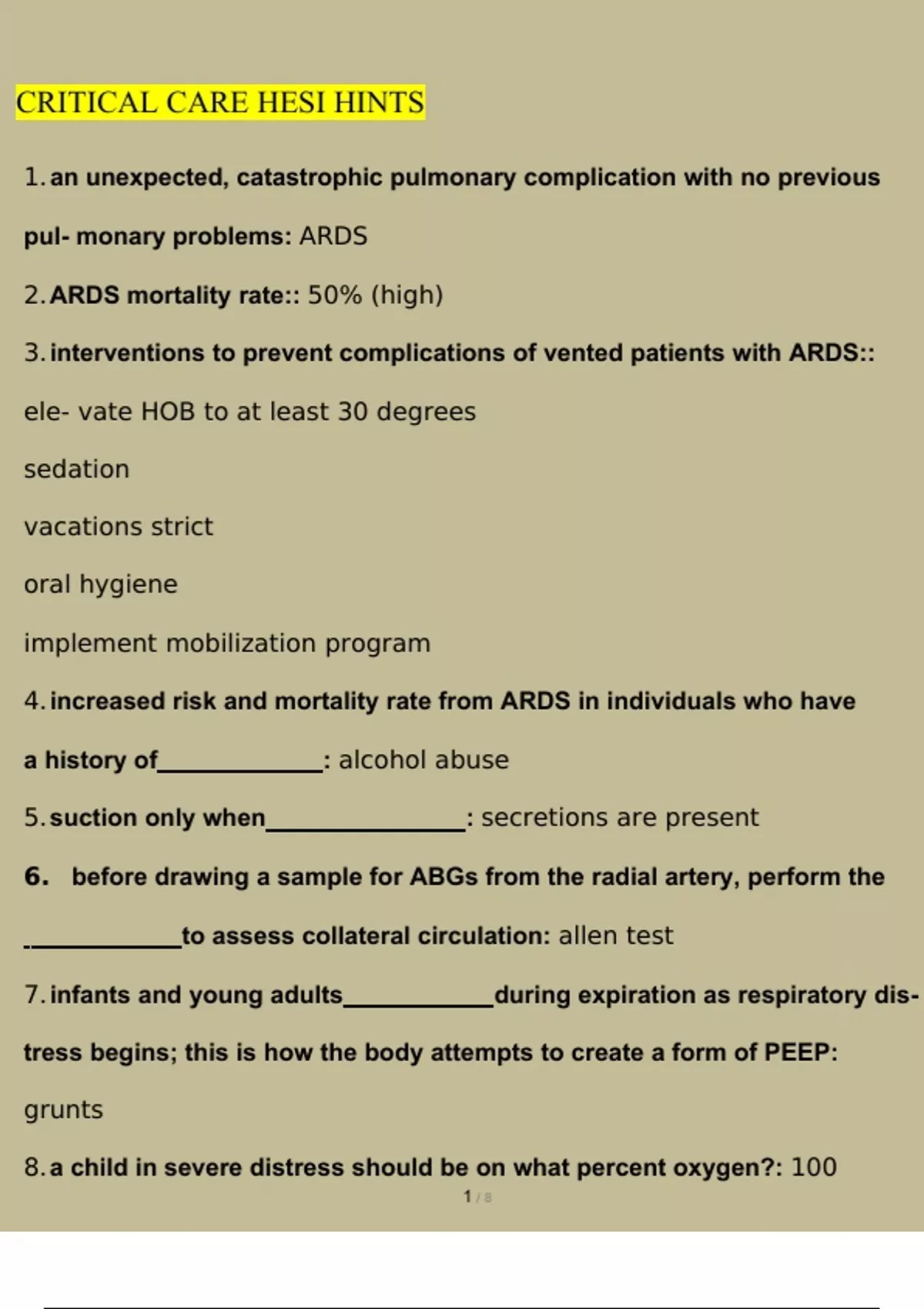 CRITICAL CARE HESI HINTS Questions And Answers (Complete Update)