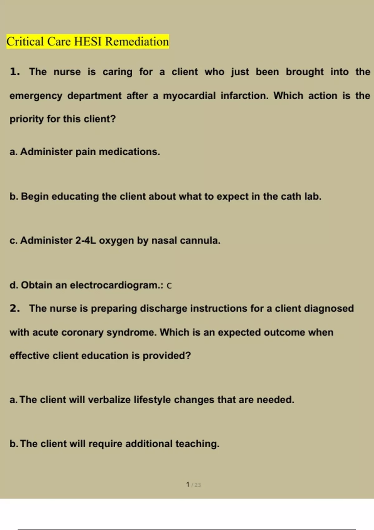 Critical Care HESI Remediation Questions and Answers (2023 / 2024) (Verified Answers)