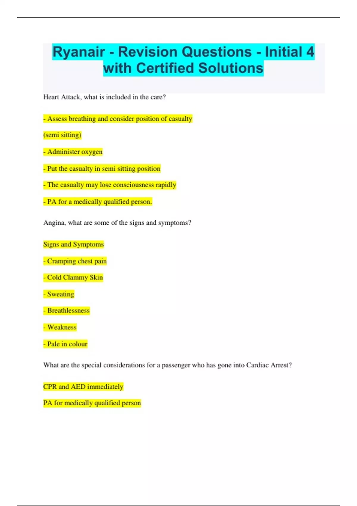 Ryanair - Revision Questions - Initial 4 with Certified Solutions Heart Attack, what is included in the care? - Assess breathing and consider position of casualty (semi sitting) - Administer oxygen - Put the casualty in semi sitting position - The casualty may lose consciousness rapidly - PA for a medically qualified person. Angina, what are some of the signs and symptoms? Signs and Symptoms - Cramping chest pain - Cold Clammy Skin - Sweating - Breathlessness - Weakness - Pale in colour What are the special considerations for a passenger who has gone into Cardiac Arrest? CPR and AED immediately PA for medically qualified person Ensure the ambulance crew are aware of the AED being used Informing the Captain What position would you put a passenger in who is suffering from Angina or Heart Attack? Semi Sitting Position Heart Attack, what are some of the signs and symptoms? Sign and Symptoms - Constricting chest pain (vice-like) radiating down often the left side - Difficulty in breathing - Ashen, cold and clammy skin - Weak, rapid pulse - Nausea and vomiting - Very frightened and may fear death What is the duration of the 120L Oxygen bottle? High flow: 30 minutes at 4 litres per minute Low flow: 60 minutes at 2 lites per minute What is the duration of the 311L Oxygen bottle? High flow: 77 minutes at 4 litres per minute Low flow: 154 minutes at 2 litres per minute Are we allowed to take a pulse? Yes, only on conscious casualty When are CC allowed to let a medically qualified person assist CC during medical emergency? After showing an id; If the medically qualified person didn't have an id with him/her, after permission from the Captain (it must be confirmed that he/she is medically qualified) What is the correct command to lift an unconscious passenger? "Prepare to Move, and MOVE!" What medication is used if a passenger has Angina? The medication is called Glycerine Trinitrate (GTN) What is the correct recovery position for infants? If a baby is unconscious and breathing, hold them on their side, head tilted