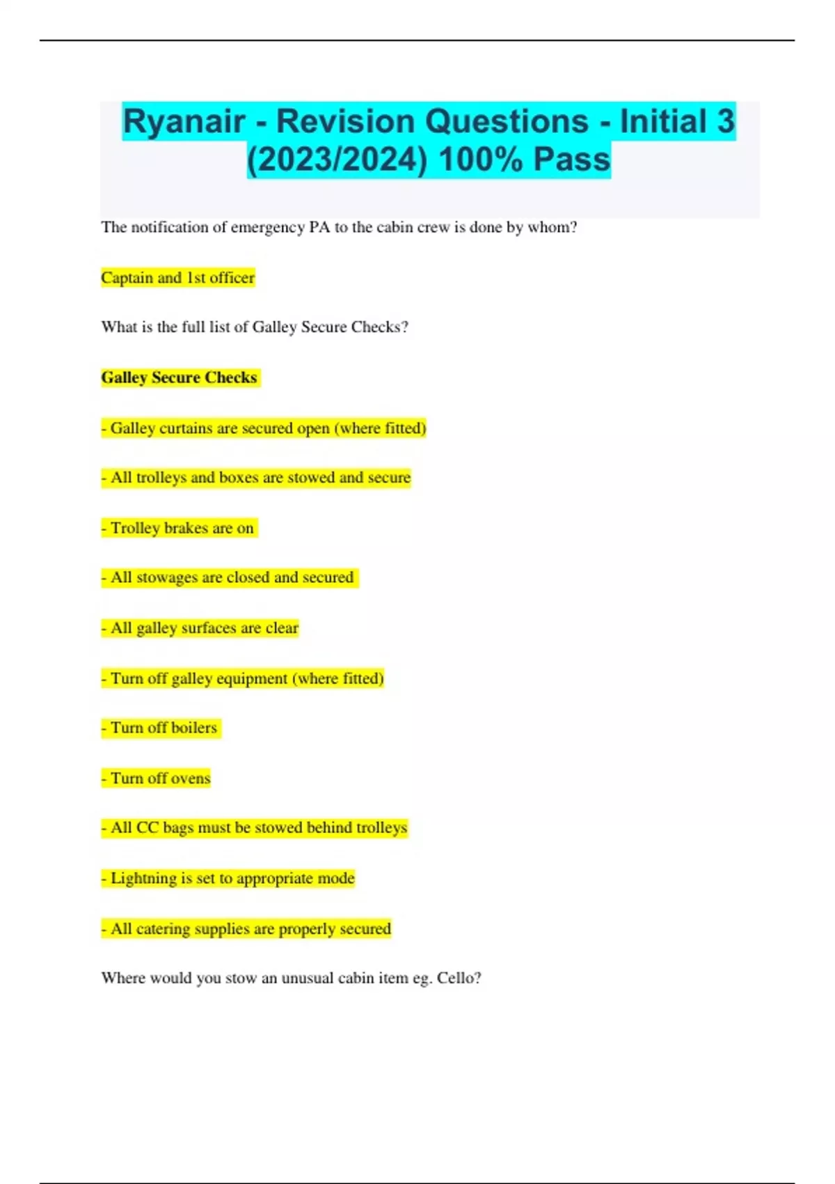 Ryanair - Revision Questions - Initial 3 (2023/2024) 100% Pass The notification of emergency PA to the cabin crew is done by whom? Captain and 1st officer What is the full list of Galley Secure Checks? Galley Secure Checks - Galley curtains are secured open (where fitted) - All trolleys and boxes are stowed and secure - Trolley brakes are on - All stowages are closed and secured - All galley surfaces are clear - Turn off galley equipment (where fitted) - Turn off boilers - Turn off ovens - All CC bags must be stowed behind trolleys - Lightning is set to appropriate mode - All catering supplies are properly secured Where would you stow an unusual cabin item eg. Cello? It may be carried on a pax window seat and not adjacent to a direct access seat. What is the full list of Toilet Secure Checks? Toilet Secure Checks - Toilets are clear of passengers - Passengers bags must NOT be placed in toilets - Only fire proof gash bags are permitted on the floor of the toilets, in the final phases of flight What are the levels of Turbulence? Light Moderate Severe What is the full list of Cabin Secure Checks? Cabin Secure Checks - All passengers are seated - Seat belts are fastened tightly and infant are secured in Infant seat belts seated on adults laps - IFDs distributed (where applicable) and parent or guardian has received a safety demonstration using the pictorial steps in the safety card - Tables are stowed - Armrest down - Window blinds are open - Hatbins/Overhead Lockes are securely closed with no bottles or heavy and hard items - Free from all bags, jackets, loose items at Emergency Exit rows, aisle and bulkheads - Baggage may only be stowed in approved stowages ensuring the labelled weight limits are not exceeded - Items shall not be secured on empty seats unless in accordance with Section 2.19.6 - Laptops and larger PEDs switched off and stowed in baggage either under the seat in front or in the overhead locker - All items cabin baggage must be returned to approved stow