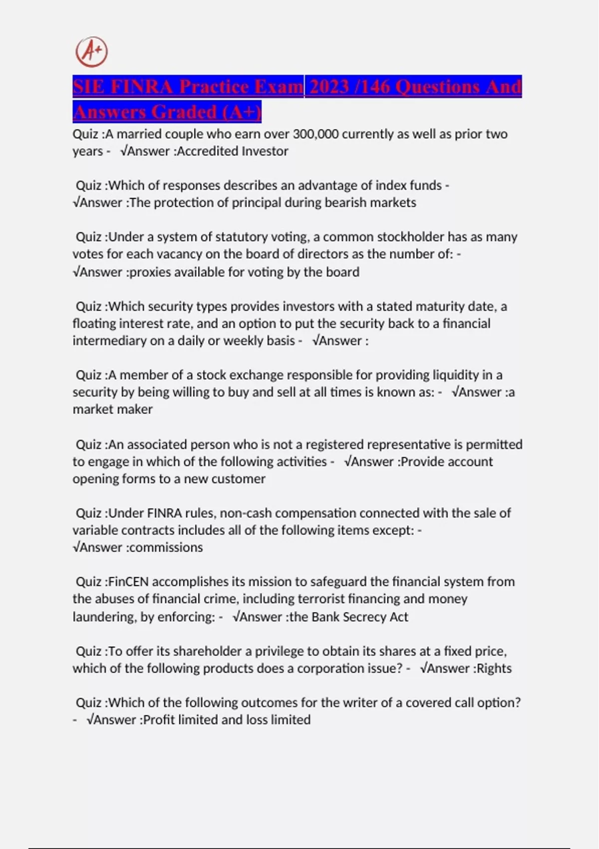 SIE FINRA Practice Exam 2023 /146 Questions And Answers Graded (A+)