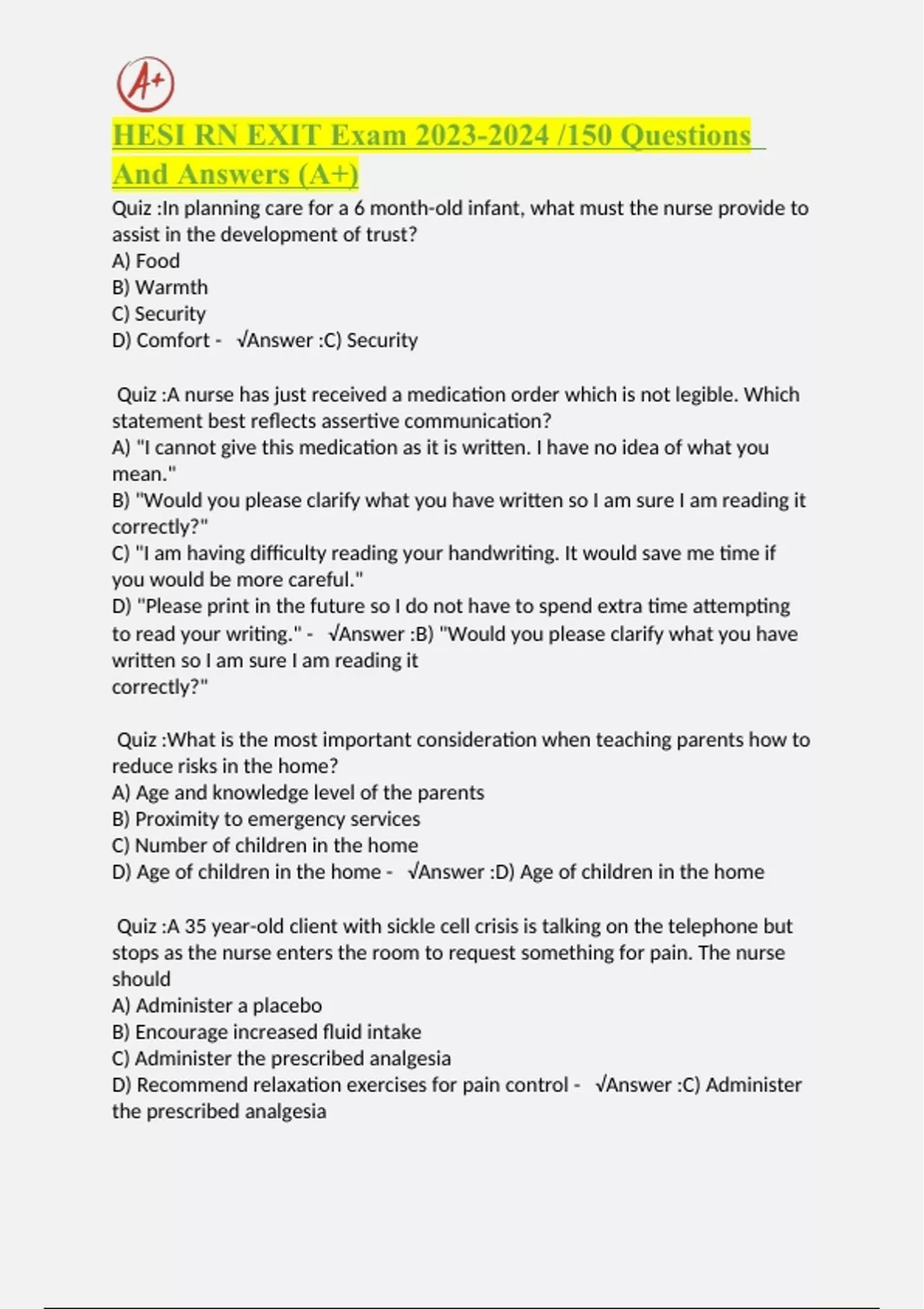 HESI RN EXIT Exam /150 Questions And Answers (A+)