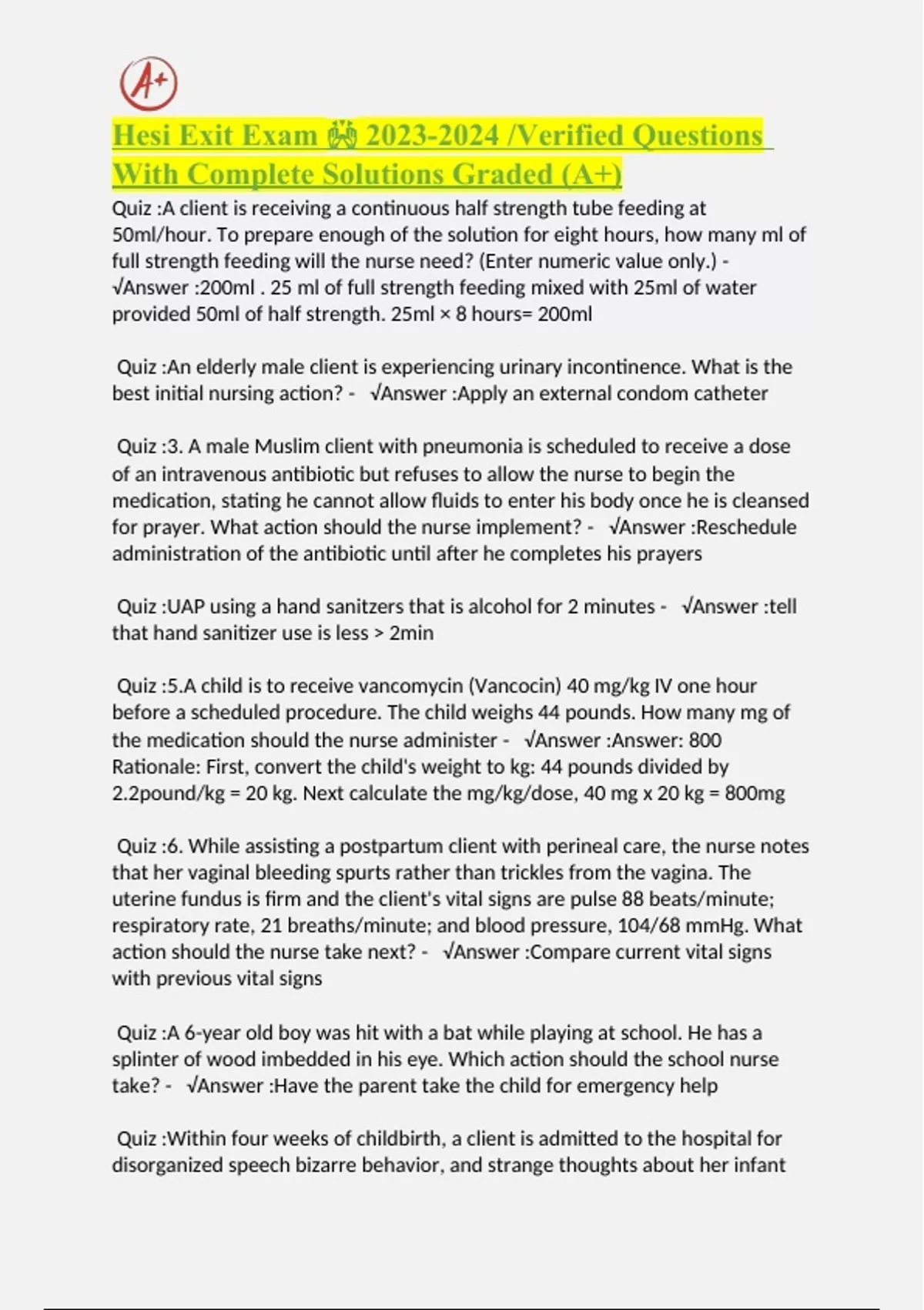 Hesi Exit Exam /Verified Questions With Complete Solutions Graded (A+)