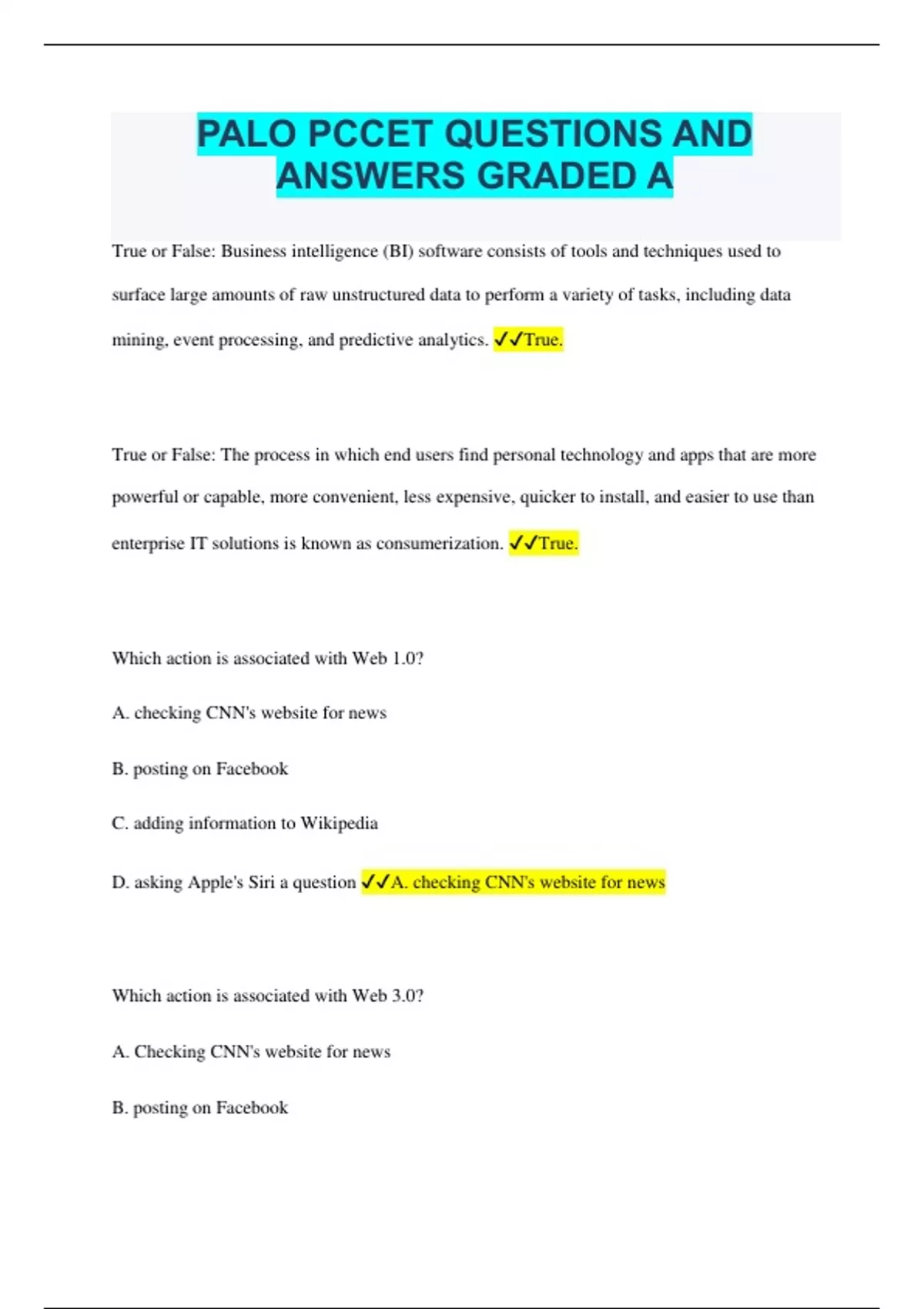 PALO PCCET QUESTIONS AND ANSWERS GRADED A True or False: Business intelligence (BI) software consists of tools and techniques used to surface large amounts of raw unstructured data to perform a variety of tasks, including data mining, event processing, and predictive analytics. True. True or False: The process in which end users find personal technology and apps that are more powerful or capable, more convenient, less expensive, quicker to install, and easier to use than enterprise IT solutions is known as consumerization. True. Which action is associated with Web 1.0? A. checking CNN's website for news B. posting on Facebook C. adding information to Wikipedia D. asking Apple's Siri a question A. checking CNN's website for news Which action is associated with Web 3.0? A. Checking CNN's website for news B. posting on Facebook C. adding information to Wikipedia D. asking Apple's Siri a question D. asking Apple's Siri a question Gmail is associated with which cloud computing model? A. SaaS B. PaaS C. IaaS D. DaaS A. SaaS Which two port numbers are associated with HTTP? (Choose two.) A. 80 B. 389 C. 8080 D. 25 A. 80 C. 8080 Which port number is associated with HTTPS? A. 21 B. 23 C. 443 D. 53 C. 443 Which port is used for encrypted communication? A. 22 B. 80 C. 389 D. 25 A. 22 Which protocol distinguishes between applications using port