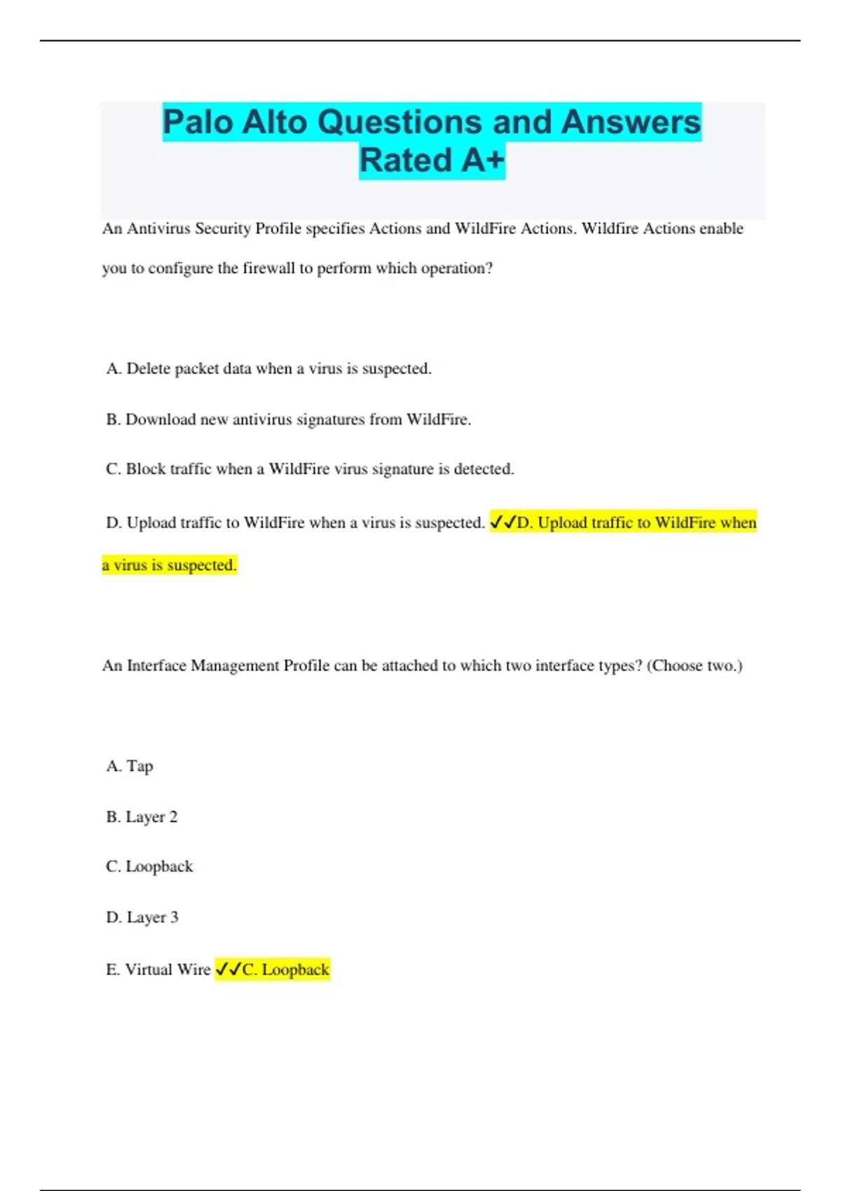 Palo Alto Questions and Answers Rated A+ An Antivirus Security Profile specifies Actions and WildFire Actions. Wildfire Actions enable you to configure the firewall to perform which operation? A. Delete packet data when a virus is suspected. B. Download new antivirus signatures from WildFire. C. Block traffic when a WildFire virus signature is detected. D. Upload traffic to WildFire when a virus is suspected. D. Upload traffic to WildFire when a virus is suspected. An Interface Management Profile can be attached to which two interface types? (Choose two.) A. Tap B. Layer 2 C. Loopback D. Layer 3 E. Virtual Wire C. Loopback D. Layer 3 App-ID running on a firewall identifies applications using which three methods? (Choose three.) A. PAN-DB lookups B. WildFire lookups C. Application signatures D. Program heuristics E. Known protocol decoders C. Application signatures D. Program heuristics E. Known protocol decoders Application block pages can be enabled for which applications? A. any B. web-based C. MGT port-based D. non-TCP/IP B. web-based Because a firewall examines every packet in a session, a firewall can detect application ________? A. shifts B. errors C. groups D. filters A. shifts Finding URLs matched to the not-resolved URL category in the URL Filtering log file might indicate that you should take which action? A.Reboot the firewall. B. Validate your Security policy rules. C. Validate