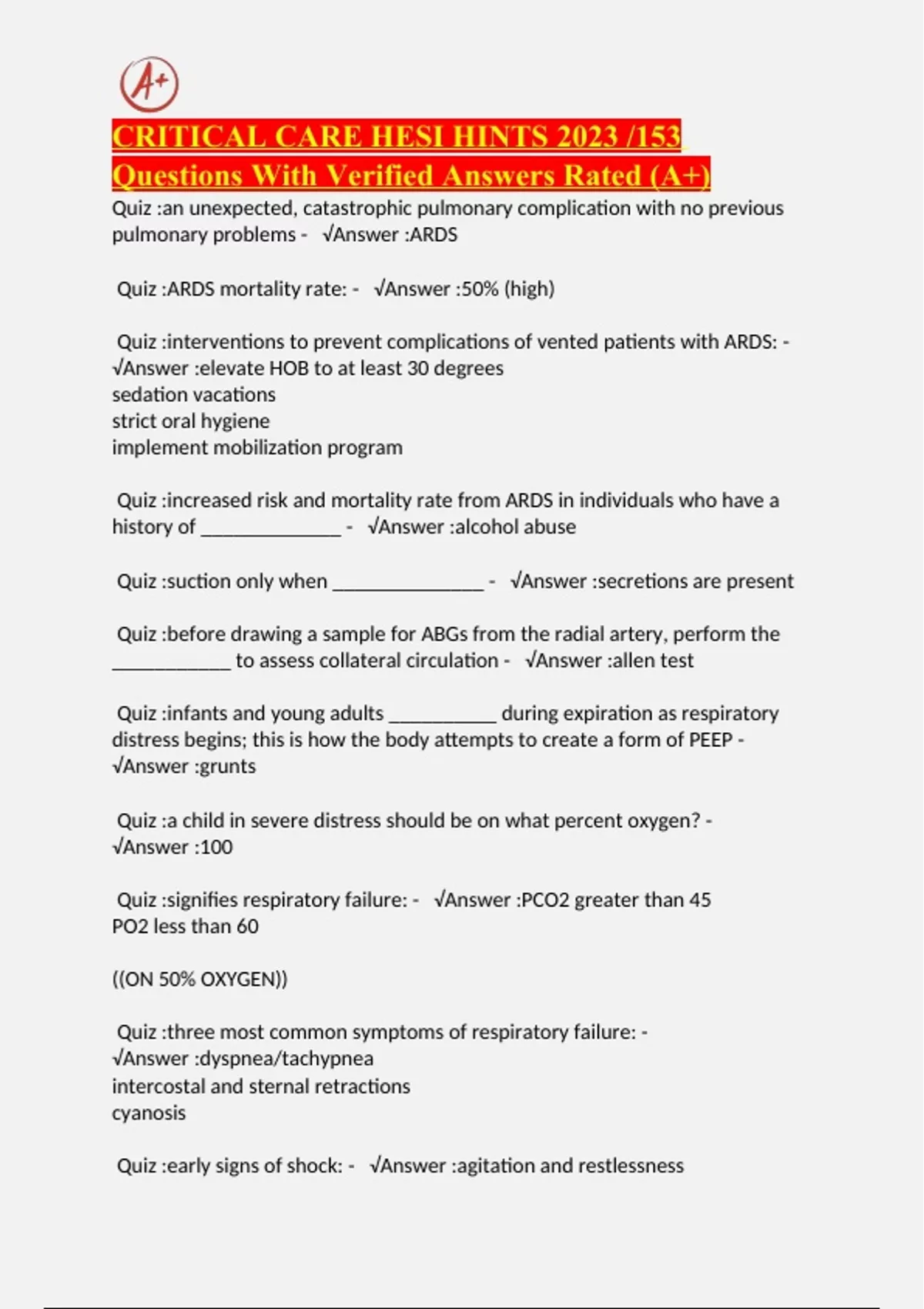 CRITICAL CARE HESI HINTS 2023 /153 Questions With Verified Answers Rated (A+)