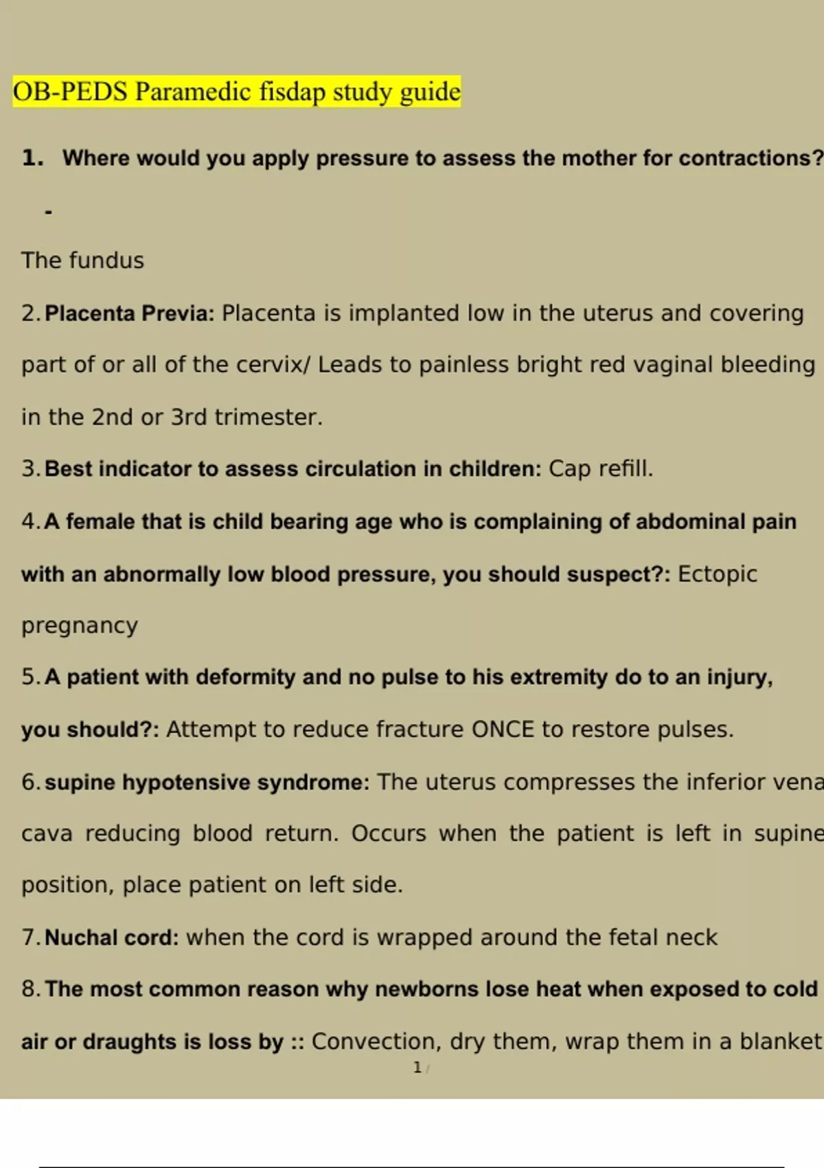 OB Pediatric Paramedic FISDAP study guide Questions and Answers (2023 / 2024) (Verified Answers)