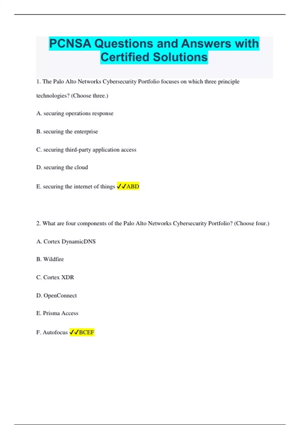 PCNSA Questions and Answers with Certified Solutions 1. The Palo Alto Networks Cybersecurity Portfolio focuses on which three principle technologies? (Choose three.) A. securing operations response B. securing the enterprise C. securing third-party application access D. securing the cloud E. securing the internet of things ABD 2. What are four components of the Palo Alto Networks Cybersecurity Portfolio? (Choose four.) A. Cortex DynamicDNS B. Wildfire C. Cortex XDR D. OpenConnect E. Prisma Access F. Autofocus BCEF 3. Which cloud-delivered security service provides instant access to community-based threat data? A. Prisma Saas B. Autofocus C. Unit 42 D. Cortex XOR B 4. Which cloud-delivered security service provides security and connectivity for branches and mobile users? A. Cortex XSOAR B. Cortex XOR C. AutoFocus D. Prisma Access D 5. Which Palo Alto Networks Cybersecurity Portfolio product provides access to applications from Palo Alto Networks, third parties, and customers? A. WildFire B. Cortex Data Lake C. Network Security D. Prisma Access B 6. Which Palo Alto Networks firewall feature provides all the following abilities? • Stops malware, exploits, and ransomware before they can compromise endpoints • Provides protection while endpoints are online and offline, on network and off • Coordinates enforcement with network and cloud security to prevent successful attacks • Detects threats and automates containment to minimize impact • Creates zero-day malware signatures with cloud-based threat analysis • Integrates with Palo Alto Networks Cortex Data Lake A. Cortex XDR B. Prisma Saas C. WildFire D. AutoFocus A 7.