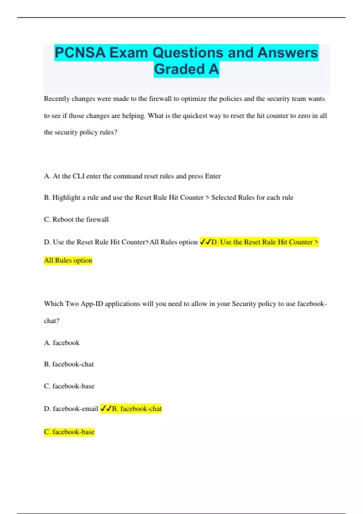 PCNSA Exam Questions and Answers Graded A Recently changes were made to the firewall to optimize the policies and the security team wants to see if those changes are helping. What is the quickest way to reset the hit counter to zero in all the security policy rules? A. At the CLI enter the command reset rules and press Enter B. Highlight a rule and use the Reset Rule Hit Counter > Selected Rules for each rule C. Reboot the firewall D. Use the Reset Rule Hit Counter>All Rules option D. Use the Reset Rule Hit Counter > All Rules option Which Two App-ID applications will you need to allow in your Security policy to use facebook-chat? A. facebook B. facebook-chat C. facebook-base D. facebook-email B. facebook-chat C. facebook-base Which User-ID agent would be appropriate in a network with multiple WAN links, limited network bandwidth, and limited firewall management plane resources? A. Windows-based agents deployed on the internal network B. PAN-OS integrated agent deployed on the internal network C. Citrix terminal server deployed on the internal network D. Windows-based agent deployed on each of the WAN Links A. Windows-based agent deployed on the internal network Your company requires positive username attribution of every IP address used by the wireless devices to support a new compliance requirement. You must collect IP to user mapping as soon as possible with the minimal configuration changes to the wireless devices themselves. the wireless devices are from various manufactures. Given the scenario, choose the option for sending IP-to user mapping to the NGFW. A. syslog B. RADIUS C. UID redistribution D. XFF headers A. syslog An administrator receives a global notification for a new malware that infects hosts. The infection will result in the infected host attempting to contact a command- and-control (C2) server. Which two security profile components will detect and prevent this threat after the firewall's signature database has been updated? (Choose two.) A. vulnerability protection profile applied to outbound security policies B. anti-spyware profile applied to outbound security policies C. antivirus profile applied to outbound security policies D. URL filtering profile applied to outbound security policies B. anti-spyware profile applied to outbound security polices D. URL filtering profile applied to out bound security Which interface does not require a MAC or IP address? A. Virtual Wire B. Layer3 C. Layer2 D. Loopback A. Virtual Wire Order