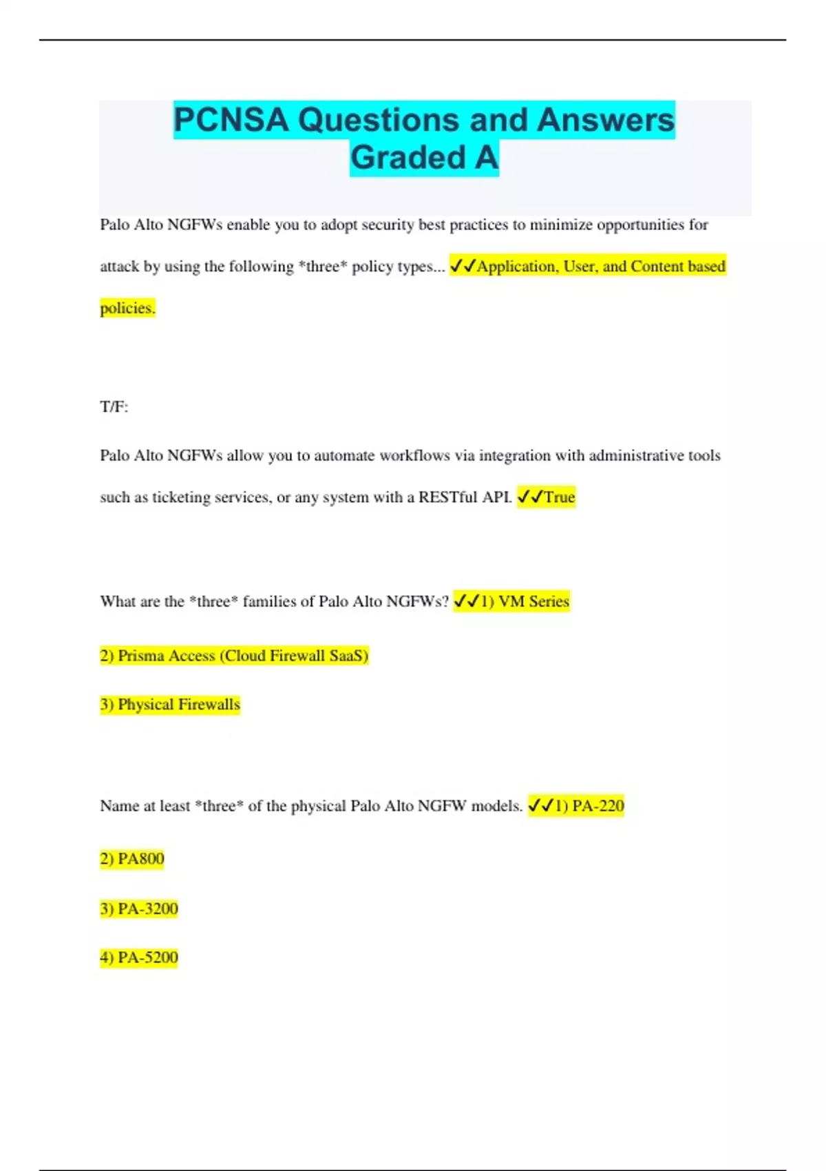 PCNSA Questions and Answers Graded A Palo Alto NGFWs enable you to adopt security best practices to minimize opportunities for attack by using the following *three* policy types... Application, User, and Content based policies. T/F: Palo Alto NGFWs allow you to automate workflows via integration with administrative tools such as ticketing services, or any system with a RESTful API. True What are the *three* families of Palo Alto NGFWs? 1) VM Series 2) Prisma Access (Cloud Firewall SaaS) 3) Physical Firewalls Name at least *three* of the physical Palo Alto NGFW models. 1) PA-220 2) PA800 3) PA-3200 4) PA-5200 5) PA-7000 Older models include: PA-200, PA-500, PA-3000 and PA-5000. What capabilities does Palo Alto Traps *Advanced Endpoint Protection* provide? Advanced Endpoint Protection blocks: exploits, ransomware, malware, and fileless attacks to minimize infected endpoints and servers. What does *AutoFocus* provide? AutoFocus provides instant access to community-based threat data, enhanced with deep context and attribution from the Unit 42 threat research team, saving analysts time and effort. How often is the WildFire cloud database updated? Approximately every *5* minutes. What is Palo Alto *WildFire*? WildFire is a cloud based malware analysis and zero day exploit detection feature. What is Palo Alto *Threat Prevention*? Threat Prevention is an IPS feature for detecting network signatures. What is Palo Alto *URL Filtering*? URL Filtering is a feature for categorizing web traffic and preventing phishing attempts. What is Palo Alto *MineMeld*? MineMeld is a threat intelligence aggregation tool for gathering and applying IOCs at the firewall. What is Palo Alto *Cortex Data Lake*? Cortex Data Lake is a tool