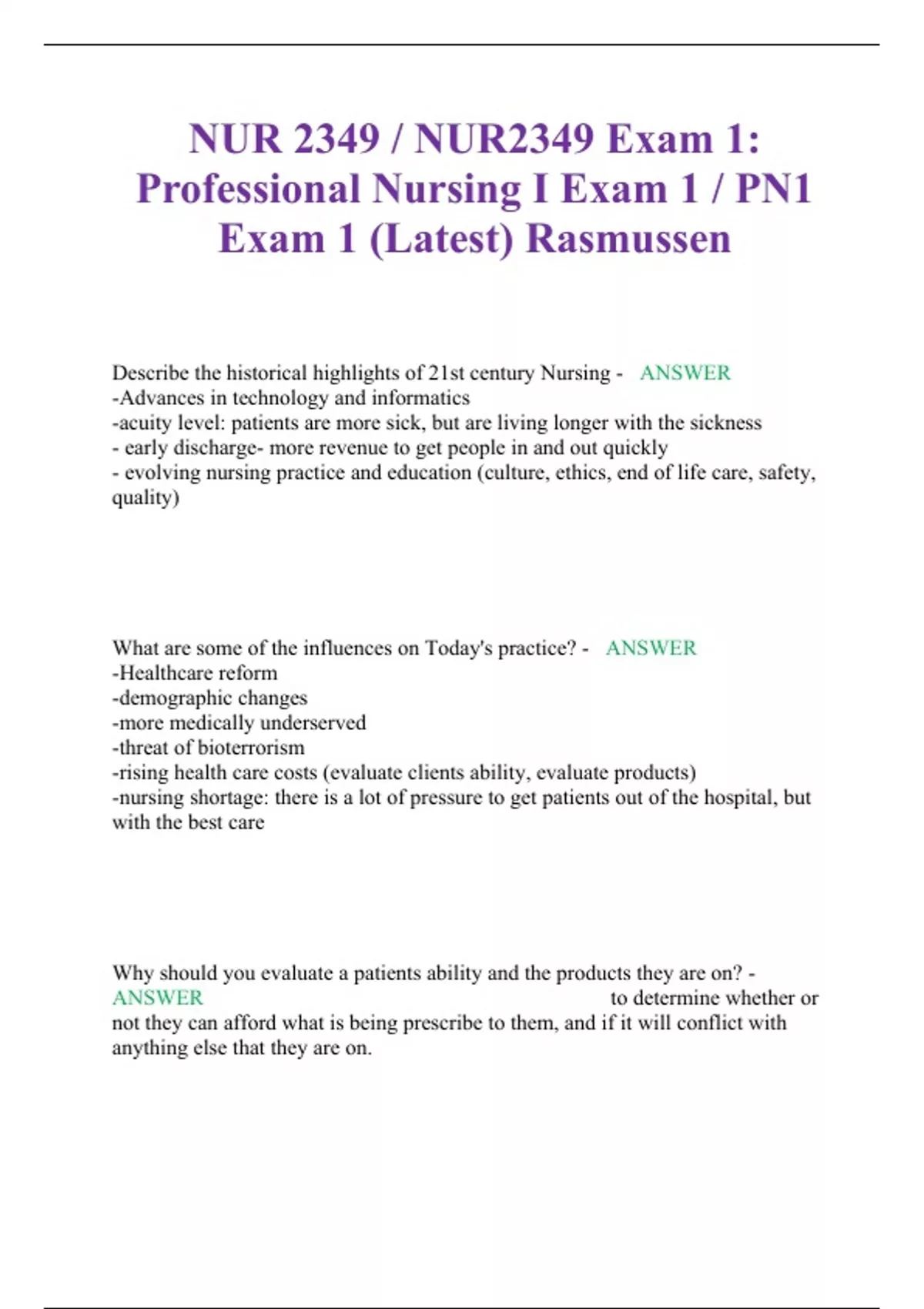 NUR 2349 / NUR2349 Exam 1: Professional Nursing I Exam 1 / PN1 Exam 1 (Latest) Rasmussen Describe the historical highlights of 21st century Nursing - ANSWER -Advances in technology and informatics -acuity level: patients are more sick, but are living longer with the sickness - early discharge- more revenue to get people in and out quickly - evolving nursing practice and education (culture, ethics, end of life care, safety, quality) What are some of the influences on Today's practice? - ANSWER -Healthcare reform -demographic changes -more medically underserved -threat of bioterrorism -rising health care costs (evaluate clients ability, evaluate products) -nursing shortage: there is a lot of pressure to get patients out of the hospital, but with the best care Why should you evaluate a patients ability and the products they are on? - ANSWER to determine whether or not they can afford what is being prescribe to them, and if it will conflict with anything else that they are on. What are the Scopes and Standards of practice for the Nursing Profession? (acts and associations) - ANSWER -American Nurses Association (ANA) -Standards of Nursing Practice (minimal level of competency you are expected to have) -Standards of Professional Performance (competency level of behavior) -American Nurses Association Code of Ethics for Nurses With Interpretive Statement -State Board Nurses Practice Acts What do the State Board Nurses Practice Acts regulate? - ANSWER -the scope of nursing practice to protect the public -legal regulations What are the six standards of practice? - ANSWER 1. Assessment 2. Diagnosis 3. Outcome identifications 4. Planning 5. Implementation 6. Evaluation