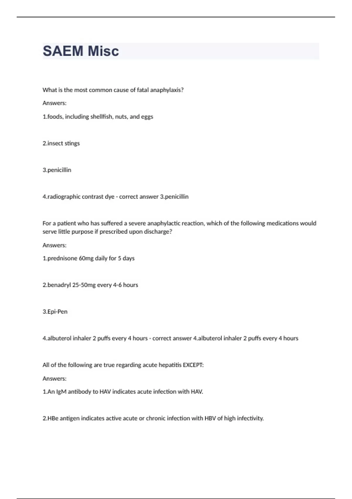 What is the most common cause of fatal anaphylaxis? Answers: , including shellfish, nuts, and eggs t stings illin graphic contrast dye - correct answer illin For a patient who has suffered a severe anaphylactic reaction, which of the following medications would serve little purpose if prescribed upon discharge? Answers: isone 60mg daily for 5 days ryl 25-50mg every 4-6 hours 3.Epi-Pen erol inhaler 2 puffs every 4 hours - correct answer erol inhaler 2 puffs every 4 hours All of the following are true regarding acute hepatitis EXCEPT: Answers: 1.An IgM antibody to HAV indicates acute infection with HAV. 2.HBe antigen indicates active acute or chronic infection with HBV of high infectivity