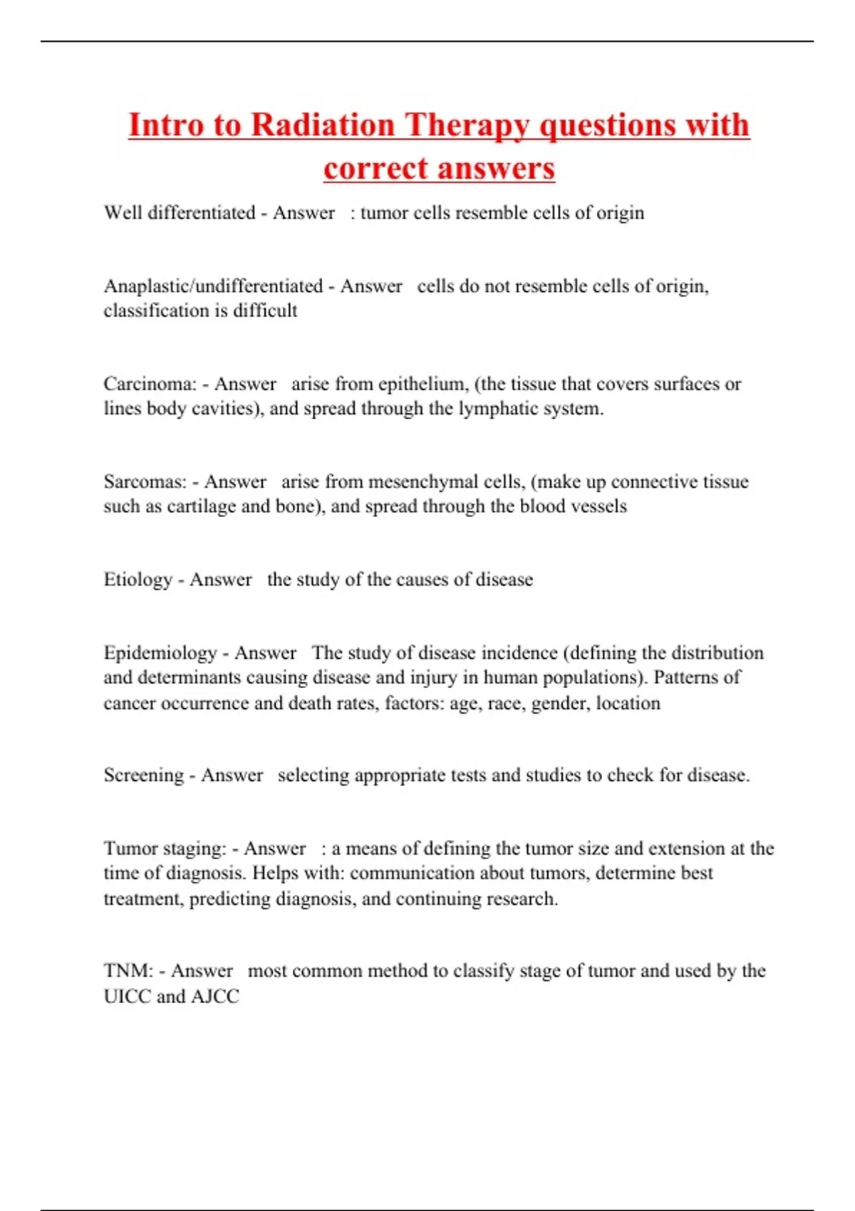 Well differentiated - Answer : tumor cells resemble cells of origin Anaplastic/undifferentiated - Answer cells do not resemble cells of origin, classification is difficult Carcinoma: - Answer arise from epithelium, (the tissue that covers surfaces or lines body cavities), and spread through the lymphatic system. Sarcomas: - Answer arise from mesenchymal cells, (make up connective tissue such as cartilage and bone), and spread through the blood vessels Etiology - Answer the study of the causes of disease Epidemiology - Answer The study of disease incidence (defining the distribution and determinants causing disease and injury in human populations). Patterns of cancer occurrence and death rates, factors: age, race, gender, location Screening - Answer selecting appropriate tests and studies to check for disease. Tumor staging: - Answer : a means of defining the tumor size and extension at the time of diagnosis. Helps with: communication about tumors, determine best treatment, predicting diagnosis, and continuing research. TNM: - Answer most common method to classify stage of tumor and used by the UICC and AJCC