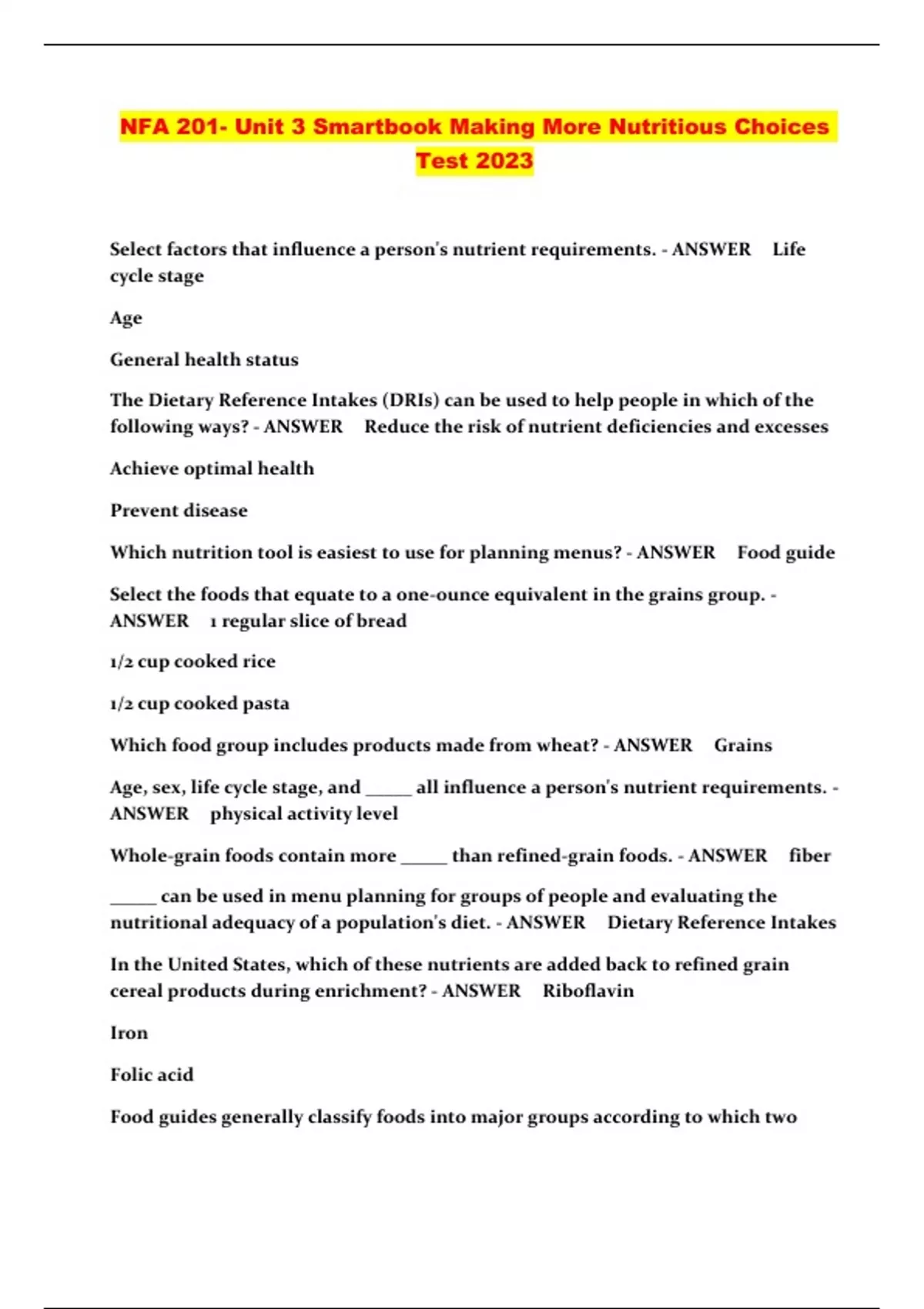 NFA 201- Unit 3 Smartbook Making More Nutritious Choices Test 2023...