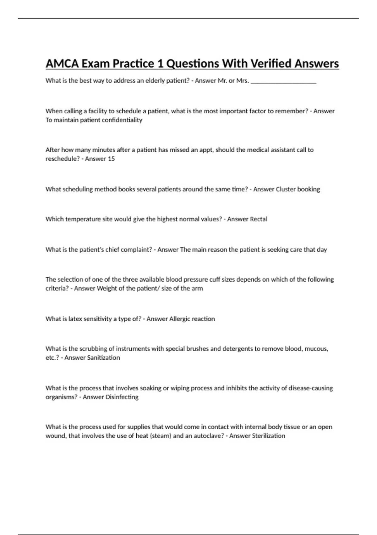 What is the best way to address an elderly patient? - Answer Mr. or Mrs. ___________________ When calling a facility to schedule a patient, what is the most important factor to remember? - Answer To maintain patient confidentiality After how many minutes after a patient has missed an appt, should the medical assistant call to reschedule? - Answer 15 What scheduling method books several patients around the same time? - Answer Cluster booking Which temperature site would give the highest normal values? - Answer Rectal What is the patient's chief complaint? - Answer The main reason the patient is seeking care that day The selection of one of the three available blood pressure cuff sizes depends on which of the following criteria? - Answer Weight of the patient/ size of the arm What is latex sensitivity a type of? - Answer Allergic reaction What is the scrubbing of instruments with special brushes and detergents to remove blood, mucous, etc.? - Answer Sanitization What is the process that involves soaking or wiping process and inhibits the activity of disease-causing organisms? - Answer Disinfecting What is the process used for supplies that would come in contact with internal body tissue or an open wound, that involves the use of heat (steam) and an autoclave? - Answer Sterilization You are taking vitals on a patient and they complain that they have dizziness every once in a while. What type of symptom is this? - Answer Subjective Which procedure that requires patient intervention should be documented for patient reference? - Answer Clinical procedure The immune system protects the body from which of the following? - Answer Disease and infection A procedure for filing insurance claims would be found under which policies section of the procedure manual? - Answer Administrative What is the proper sequence for CPR? - Answer Circulation, Airway, Breathing (CAB) The immune system protects the body from? - Answer Disease and infection What is the general term for a surgical suture? - Answer Ligature Which instrument is used to drain an abscess? - Answer Scalpel In which stage of infection is known as the time where the pathogen has had the time to grow and establish itself in the body? - Answer Incubation What are the six C's of charting? - Answer -Client's words -Clarity -Completeness -Conciseness -Chronological order -Confidentiality An RN asks you to start an IV. Which is true? - Answer Assistive personnel do not start IV's You decide to refuse a task. What should you do? - Answer Communicate your concerns to the nurse Which of the following best defines a demographic? - Answer The statisitcal data of a population, such as age, gender, etc. What would be appropriate for free screenings? - Answer Blood pressure What type of fever is known as a fluctuating fever that remains elevated and does not return to baseline? - Answer Remittent Respiration rates can vary if abnormalities are present. Which type of abnormality is a temporary complete absence of breathing? - Answer Apnea What is accounts receivable? - Answer A record of all monies due to the practice Upon receiving cash in the doctor's office, what is the best way you should get it to the bank? - Answer Take it to the bank in person