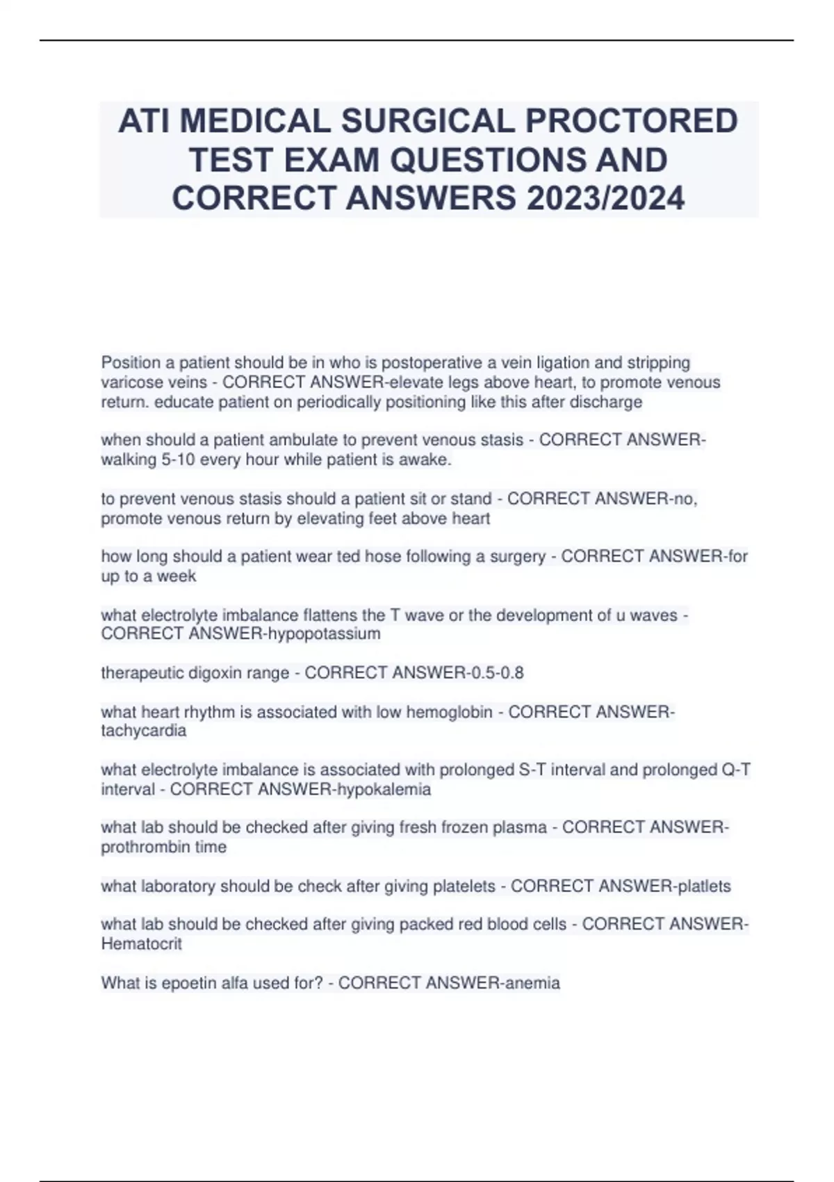 ATI MEDICAL SURGICAL PROCTORED TEST EXAM QUESTIONS AND CORRECT ANSWERS 2023/2024 Position a patient should be in who is postoperative a vein ligation and stripping varicose veins - CORRECT ANSWER -elevate legs above heart, to promote venous return. educate patient on periodic ally positioning like this after discharge when should a patient ambulate to prevent venous stasis - CORRECT ANSWER -