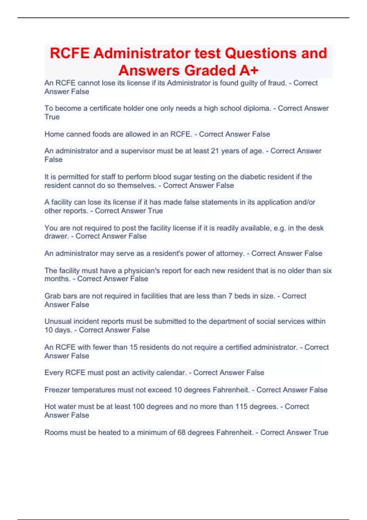 RCFE Administrator test Questions and Answers Graded A+
