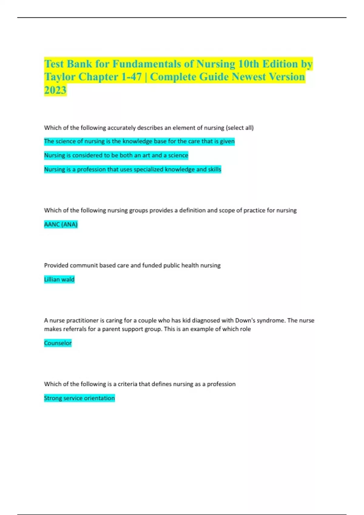 Test Bank for Fundamentals of Nursing 10th Edition by Taylor Chapter 1-47 | Complete Guide Newest Version 2023