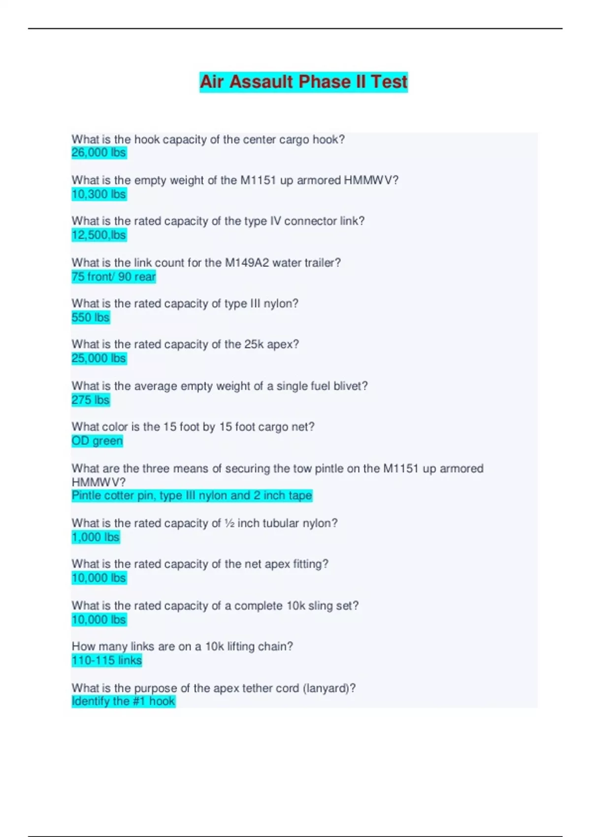 Air Assault Phase II Test - Questions and Answers What is the hook capacity of the center cargo hook? 26,000 lbs What is the empty weight of the M1151 up armored HMMWV? 10,300 lbs What is the rated capacity of the type IV connector link? 12,500,lbs What is the link count for the M149A2 water trailer? 75 front/ 90 rear What is the rated capacity of type III nylon? 550 lbs What is the rated capacity of the 25k apex? 25,000 lbs What is the average empty weight of a single fuel blivet? 275 lbs What color is the 15 foot by 15 foot cargo net? OD green What are the three means of securing the tow pintle on the M1151 up armored HMMWV? Pintle cotter pin, type III nylon and 2 inch tape What is the rated capacity of ½ inch tubular nylon? 1,000 lbs What is the rated capacity of the net apex fitting? 10,000 lbs What is the rated capacity of a complete 10k sling set? 10,000 lbs How many links are on a 10k lifting chain? 110-115 links What is the purpose of the apex tether cord (lanyard)? Identify the #1 hook Who can release the cargo hook from inside the UH-60? Pilot or crew chief What is the rated capacity of the 10k apex? 10,000 lbs What is the rated capacity of the black looped cargo hook reach pendant? 25,000 lbs What is the rated capacity of 2" tape? 80lbs per wrap What is the rated capacity of the silver load binder? 5,000 lbs What is the mesh size on the black cargo net? 7.5 inch x7.5 inch What are the components of the type IV connector link? Base plate, 2 aluminum rollers and 1 locking plate What is the rated capacity for the Ariel delivery