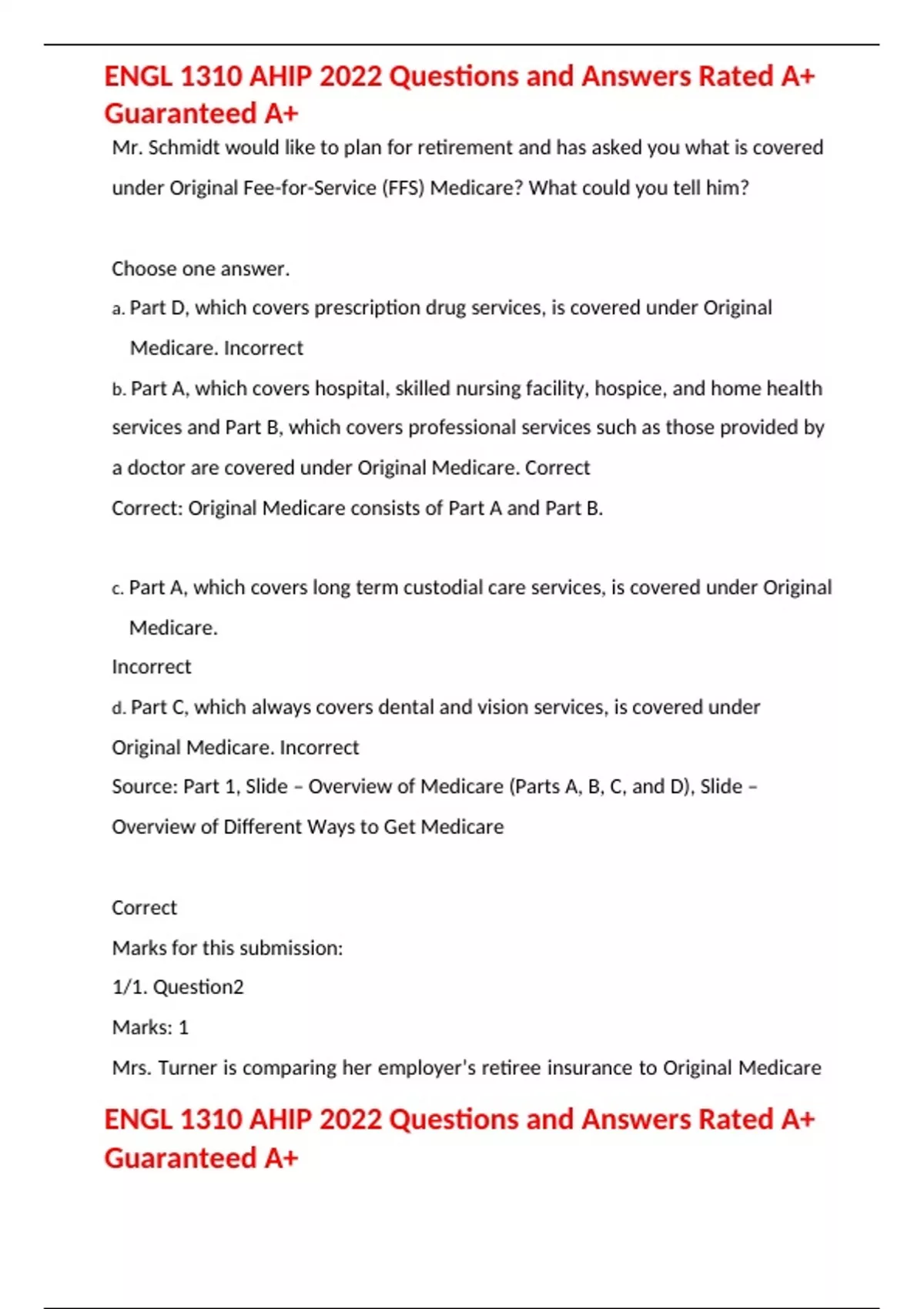 Mr. Schmidt would like to plan for retirement and has asked you what is covered under Original Fee-for-Service (FFS) Medicare? What could you tell him? Choose one answer. a. Part D, which covers prescription drug services, is covered under Original Medicare. Incorrect b. Part A, which covers hospital, skilled nursing facility, hospice, and home health services and Part B, which covers professional services such as those provided by a doctor are covered under Original Medicare. Correct Correct: Original Medicare consists of Part A and Part B. c. Part A, which covers long term custodial care services, is covered under Original Medicare. Incorrect d. Part C, which always covers dental and vision services, is covered under Original Medicare. Incorrect Source: Part 1, Slide – Overview of Medicare (Parts A, B, C, and D), Slide – Overview of Different Ways to Get Medicare Correct Marks for this submission: 1/1. Question2 Marks: 1 Mrs. Turner is comparing her employer’s retiree insurance to Original Medicare and would like to know which of the following services Original Medicare will cover if the appropriate criteria are met? What could you tell her? Choose one answer. a. Original Medicare covers cosmetic surgery. Incorrect b. Original Medicare covers routine long-term custodial care. Incorrect c. Original Medicare covers routine dental care. Incorrect d. Original Medicare covers ambulance services. Correct Correct: Original Medicare does cover ambulance services. Source: Module 1, Slide - Other Part B Items and Services and Not Covered by Medicare Part A & B Correct Marks for this submission: 1/1. Question3 Marks: 1 Ms. Moore plans to retire when she turns 65 in a few months. She is in excellent health and will have considerable income when she retires. She is concerned that her income will make it impossible for her to qualify for Medicare. What could you tell her to address her concern? Choose one answer. a. Medicare is a program for people who have incomes and assets below specific limits, so you will have to find out her exact financial situation before telling her whether she can obtain Medicare coverage. Incorrect b. Medicare is a program for people of all ages with specific mental health disabilities. Since she is in excellent health, she would not qualify, but should instead look into her state’s Medicaid program if she wants further coverage. Incorrect