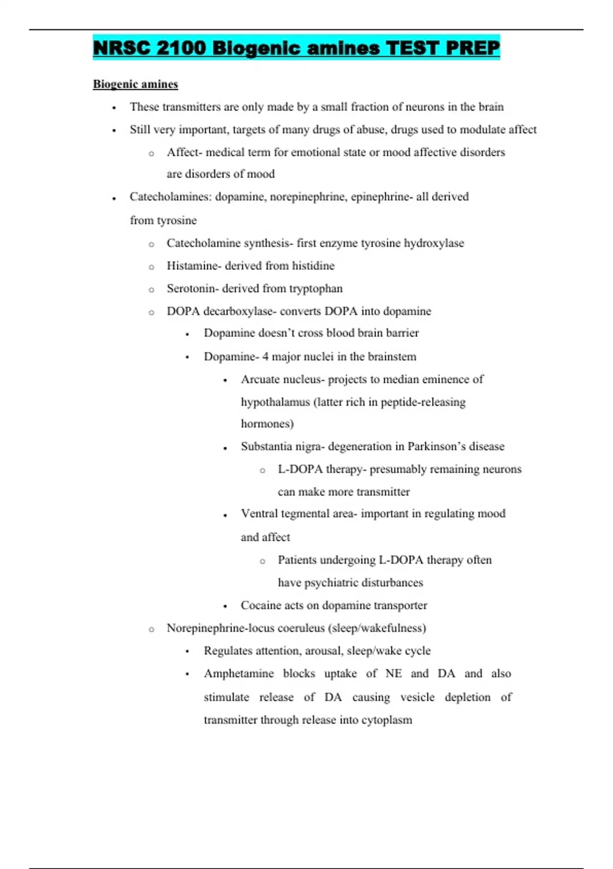 NRSC 2100 Biogenic amines TEST PREP